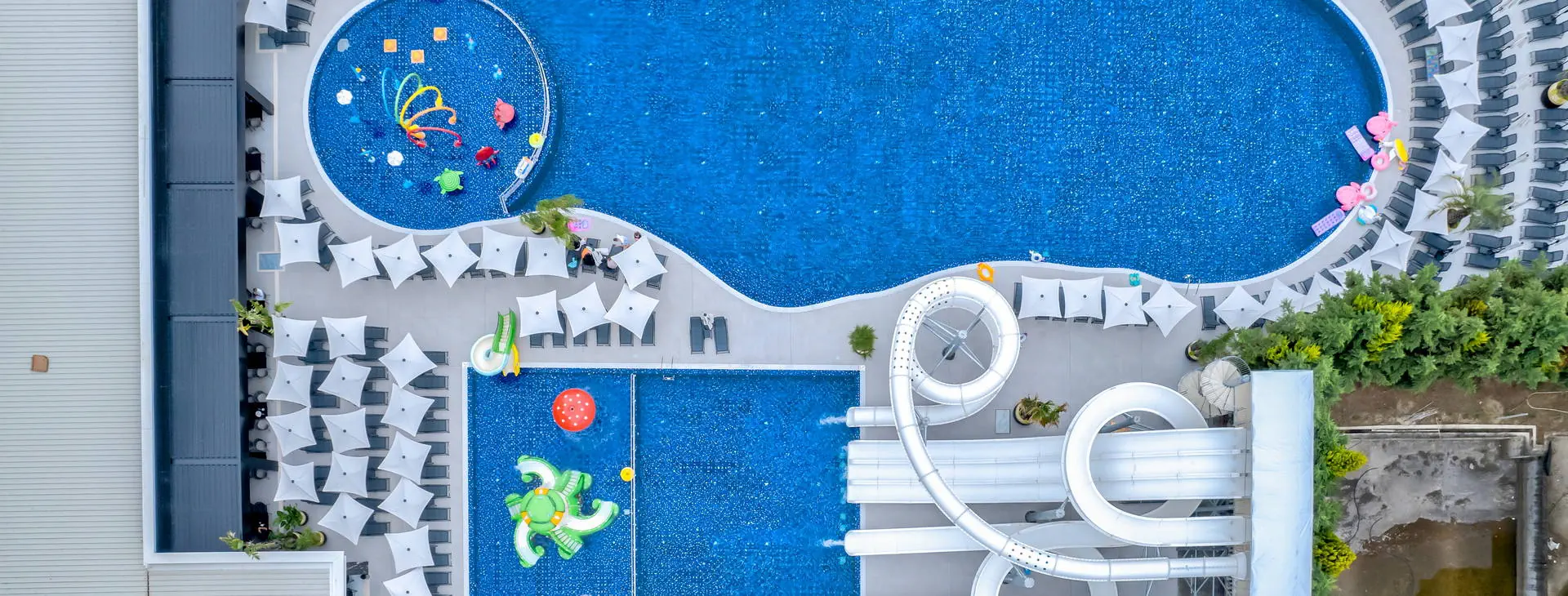 Aquapark, 5 basenów (4 na terenie aquaparku), 6 dużych zjeżdżalni oraz 2 mniejsze zjeżdżalnie dla dzieci.