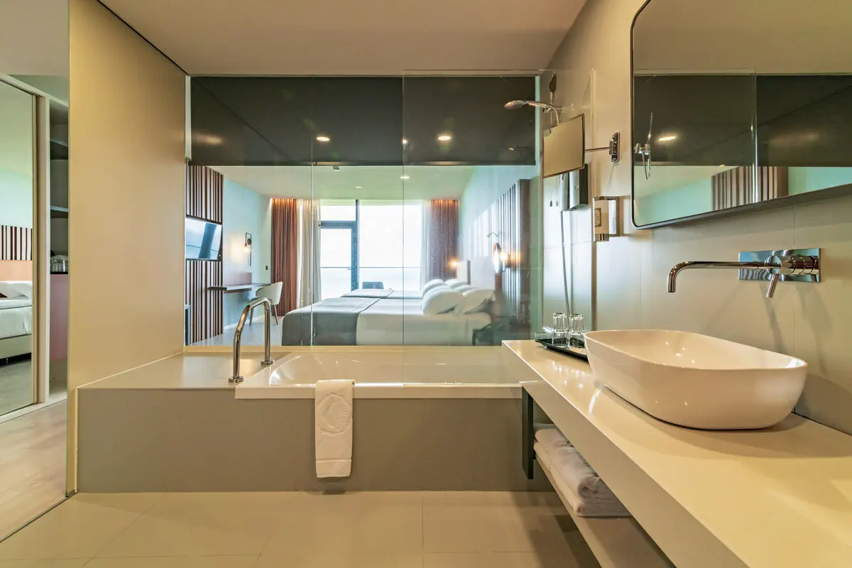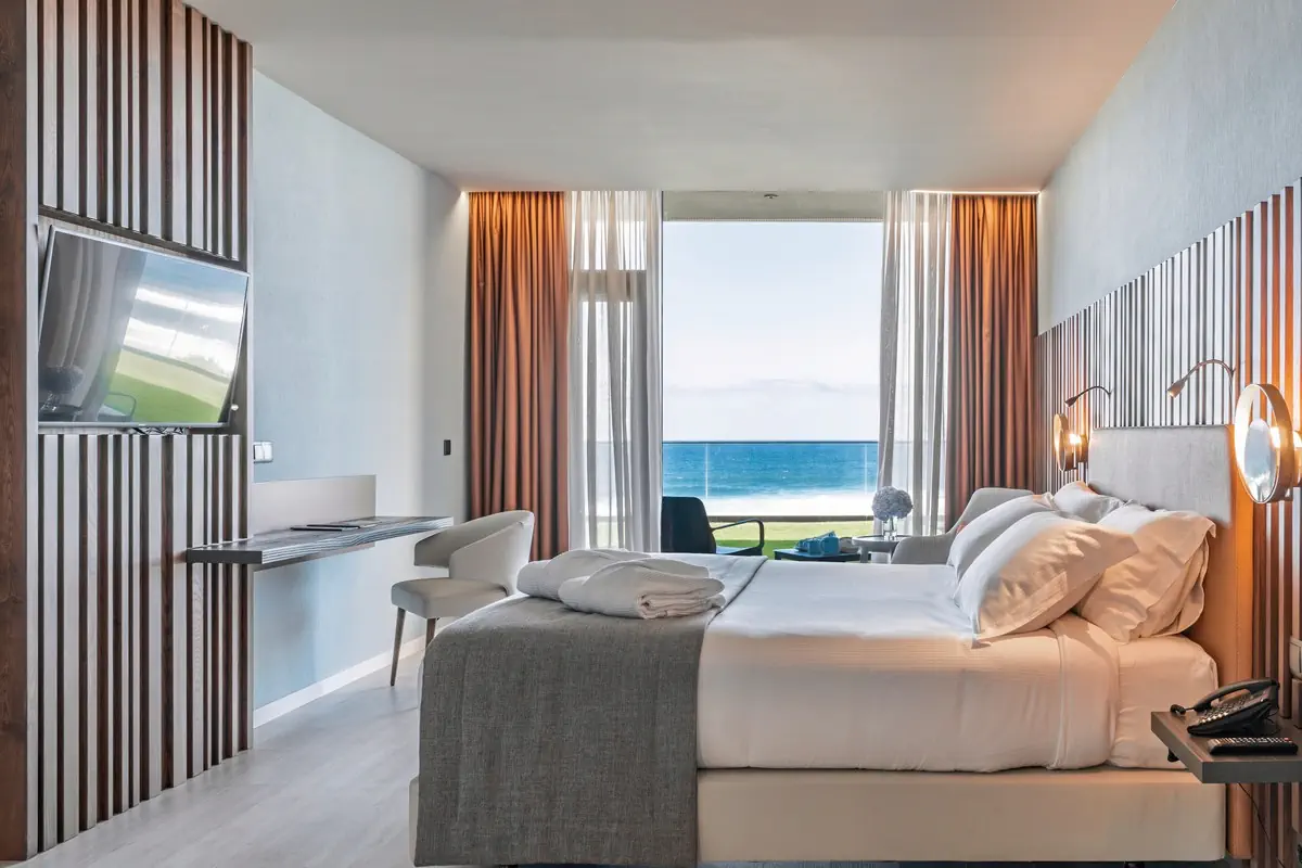 36-40 m², rodzinny, widok na morze, kącik wypoczynkowy, 2 łóżka podwójne (queen size), wanna, szlafrok kąpielowy, kapcie kapielowe, suszarka do włosów, klimatyzacja, minibar płatne, sejf (płatne), TV, Wi-Fi, czajnik, ekspres do kawy, balkon lub taras (umeblowany)Wyżywienie - Verde Mar & Spa