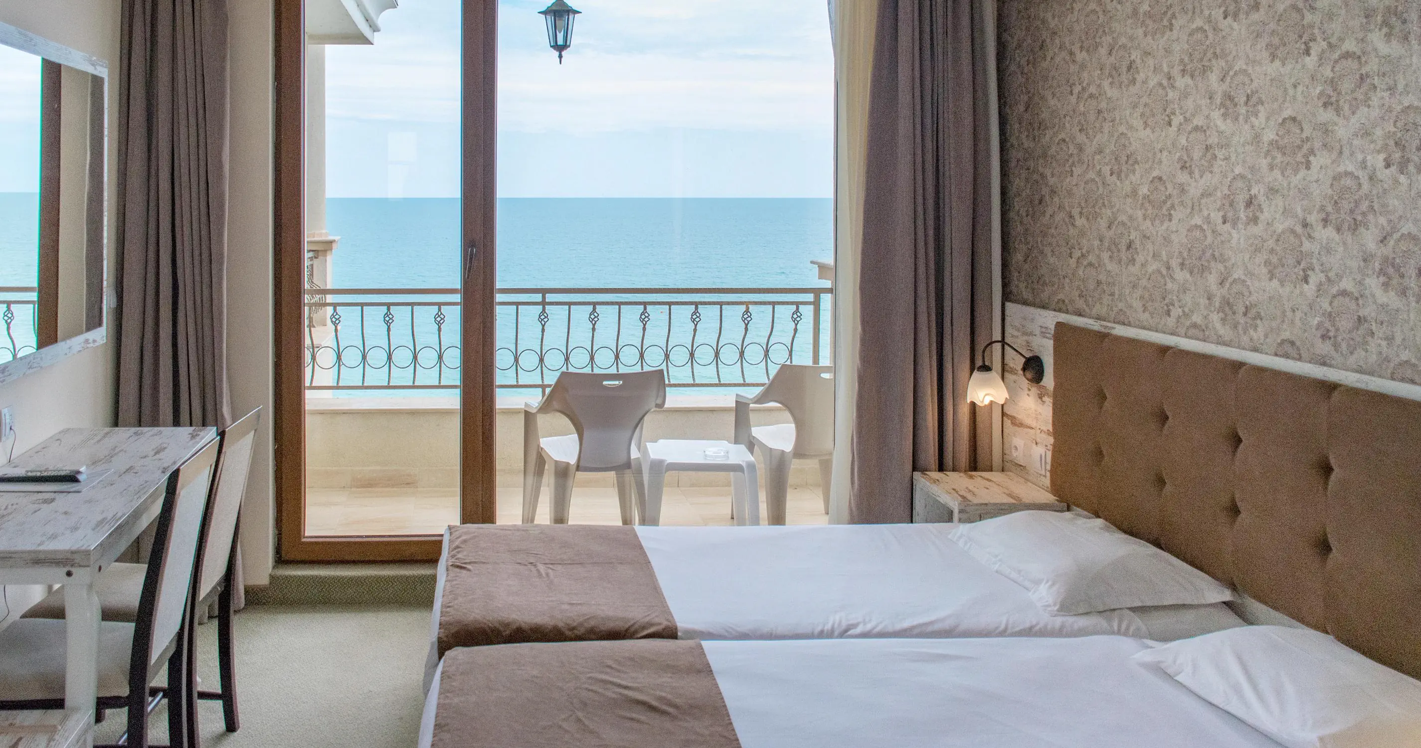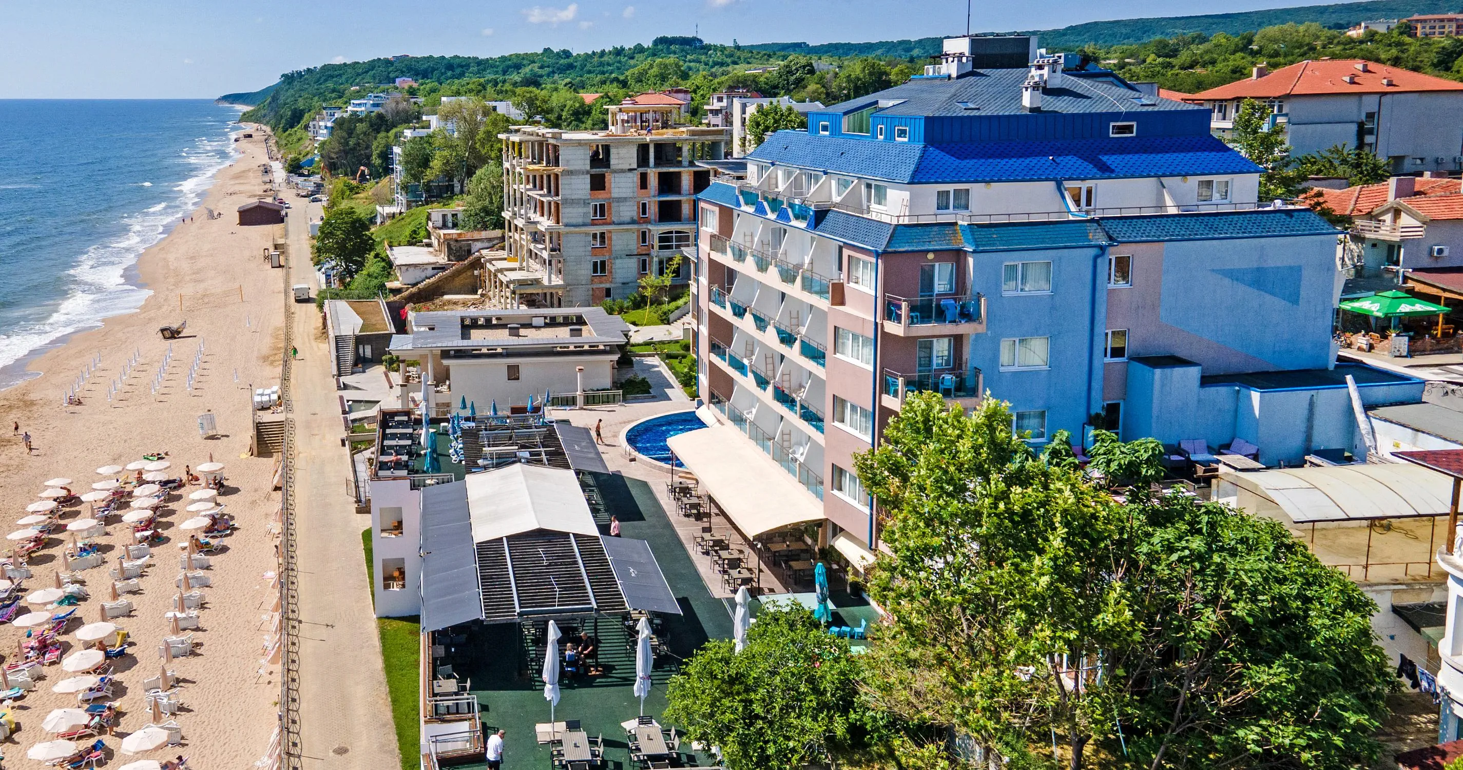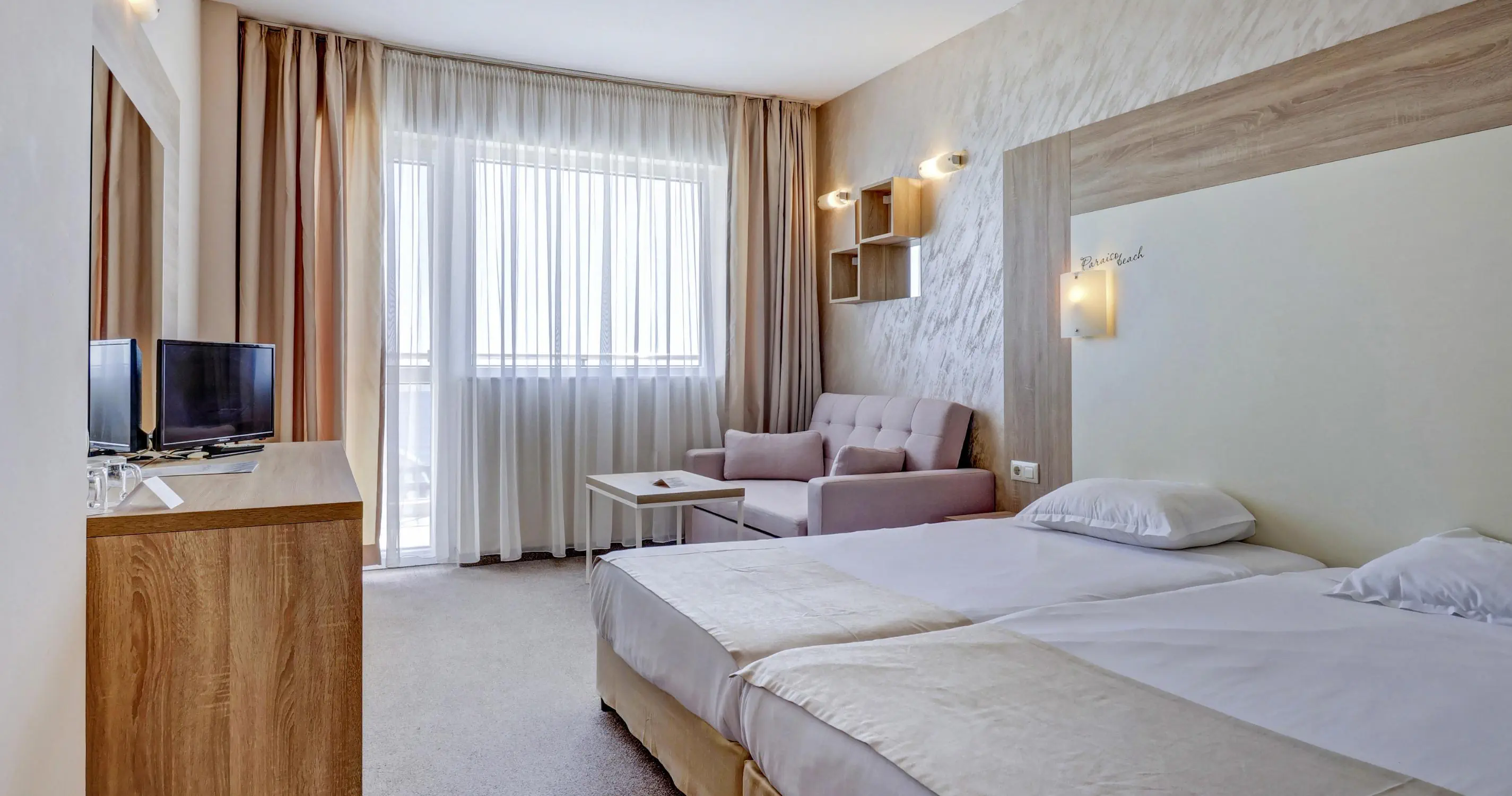 Piaszczysta, 10 m od hotelu, przejście przez promenadę Łagodne wejście do morza Leżaki i parasole - bezpłatne Ręczniki plażowe - płatne (ok. 20 BGN/pobyt)Standard rooms - Theopolis Paraiso