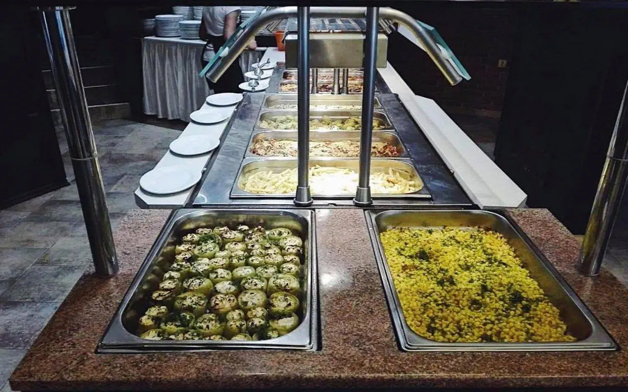 Restauracje i bary: * restauracja główna (150 miejsc) * bar w lobby * bar przy basenie All inclusive: * śniadanie: 8:00 - 10:00 w głównej restauracji, w formie bufetu * obiad: 12:30 - 14:00 w głównej restauracji, w formie bufetu * kawa, herbata, słodycze i lody: 16:00 - 17:00 * kolacja: 18:30 - 20:00 w głównej restauracji, w formie bufetu * napoje w barze w lobby: * 10:30 - 22:30 - lokalne napoje bezalkoholowe, lokalne piwo i wino, kawa, herbata * 18:30 - 22:30 - lokalne napoje alkoholowe (wódka, gin, mastyks, mięta, whisky, wermut) * napoje w barze przy basenie:10:30 - 18:30 - lokalne napoje bezalkoholowe, piwo lane i lokalne wino -