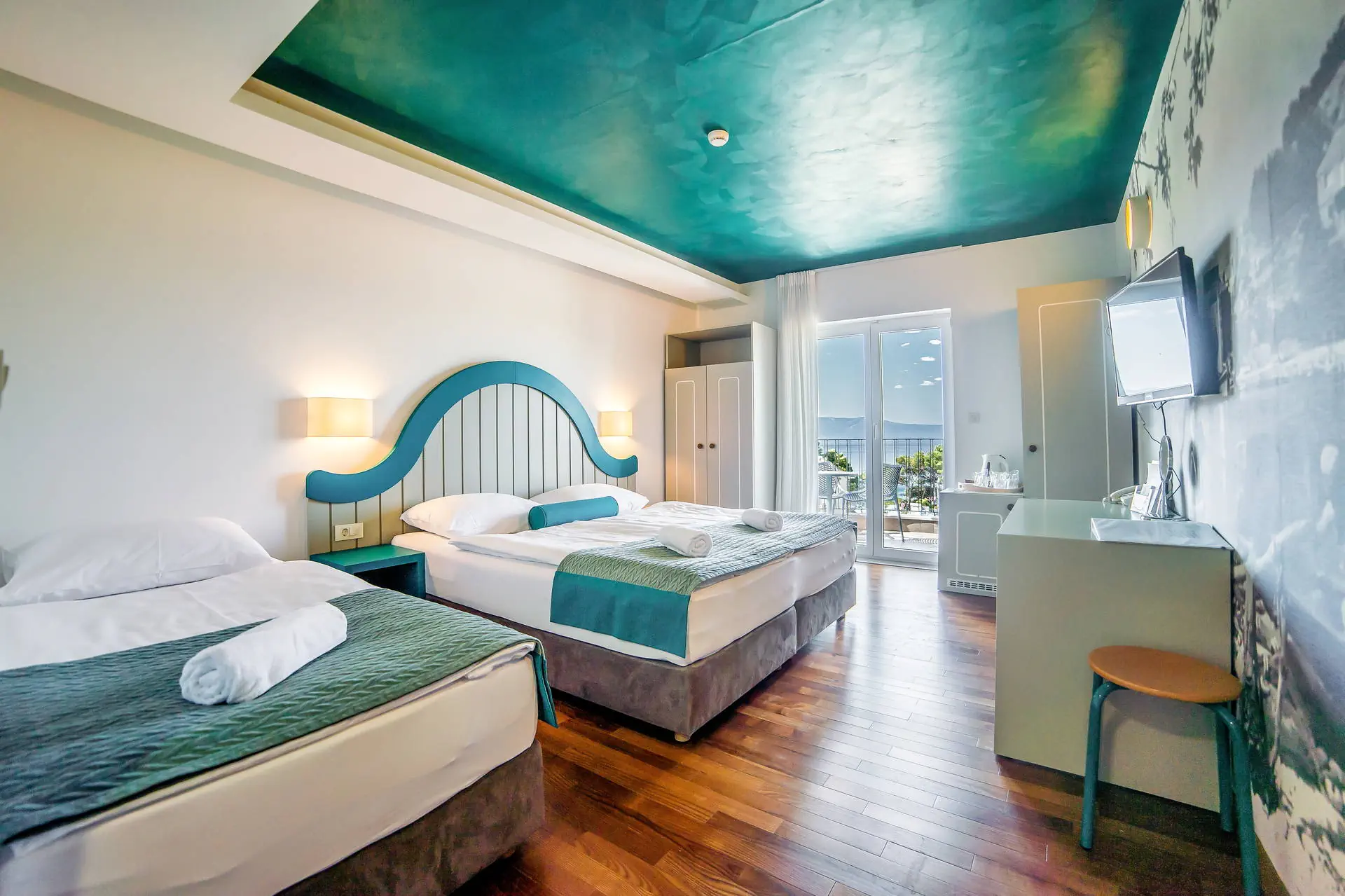 Komfortowo i ze smakiem urządzone, nowe pokoje dwuosobowe, z możliwością dostawki dla osoby dorosłej lub dziecka. Pokoje wyposażone są w łazienkę, klimatyzację, TV-SAT, lodówkę.