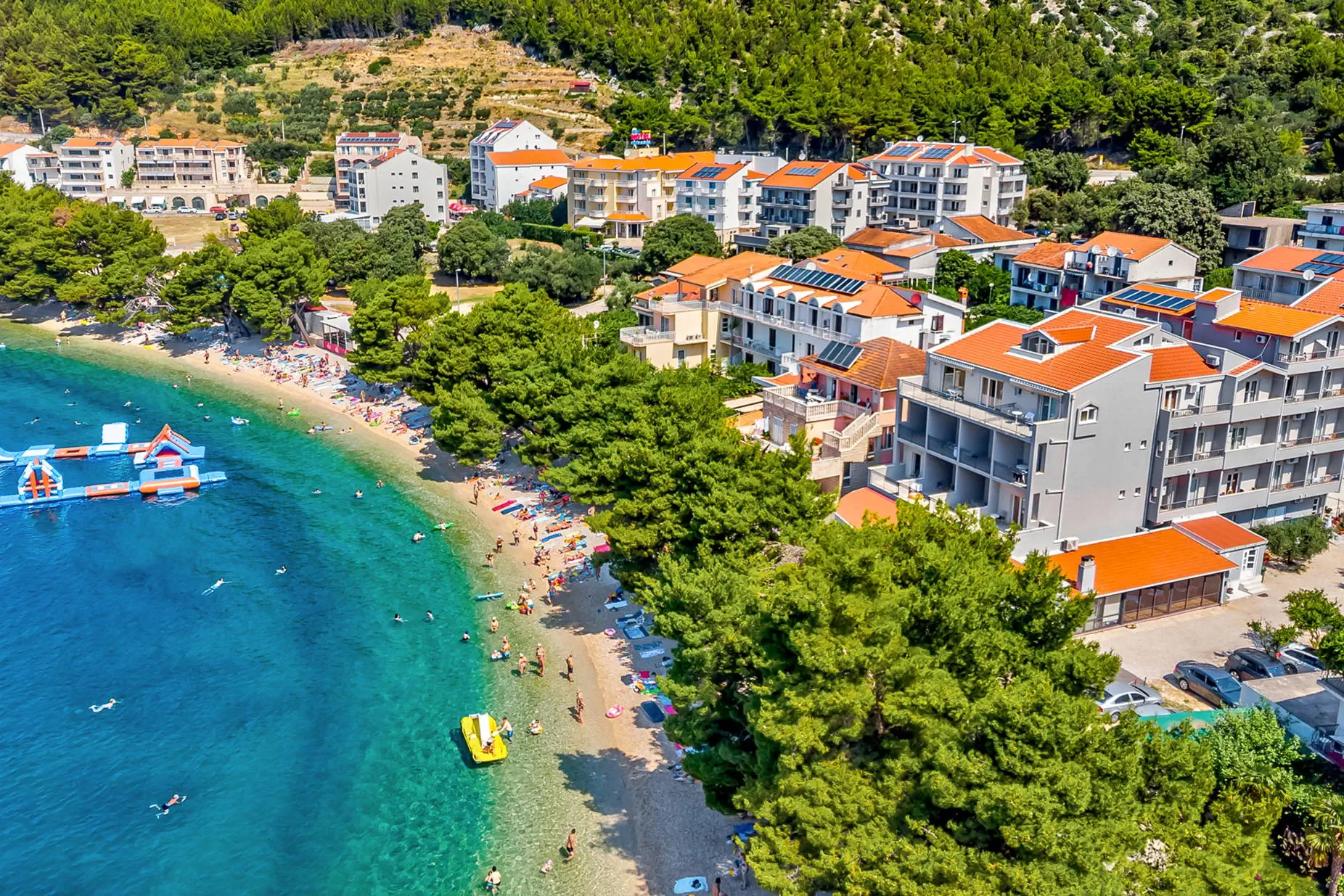 Hotel znajduje się ok 50 m od żwirkowej plaży, częściowo zacienionej przez drzewa piniowe. Łagodne zejście do wody.
