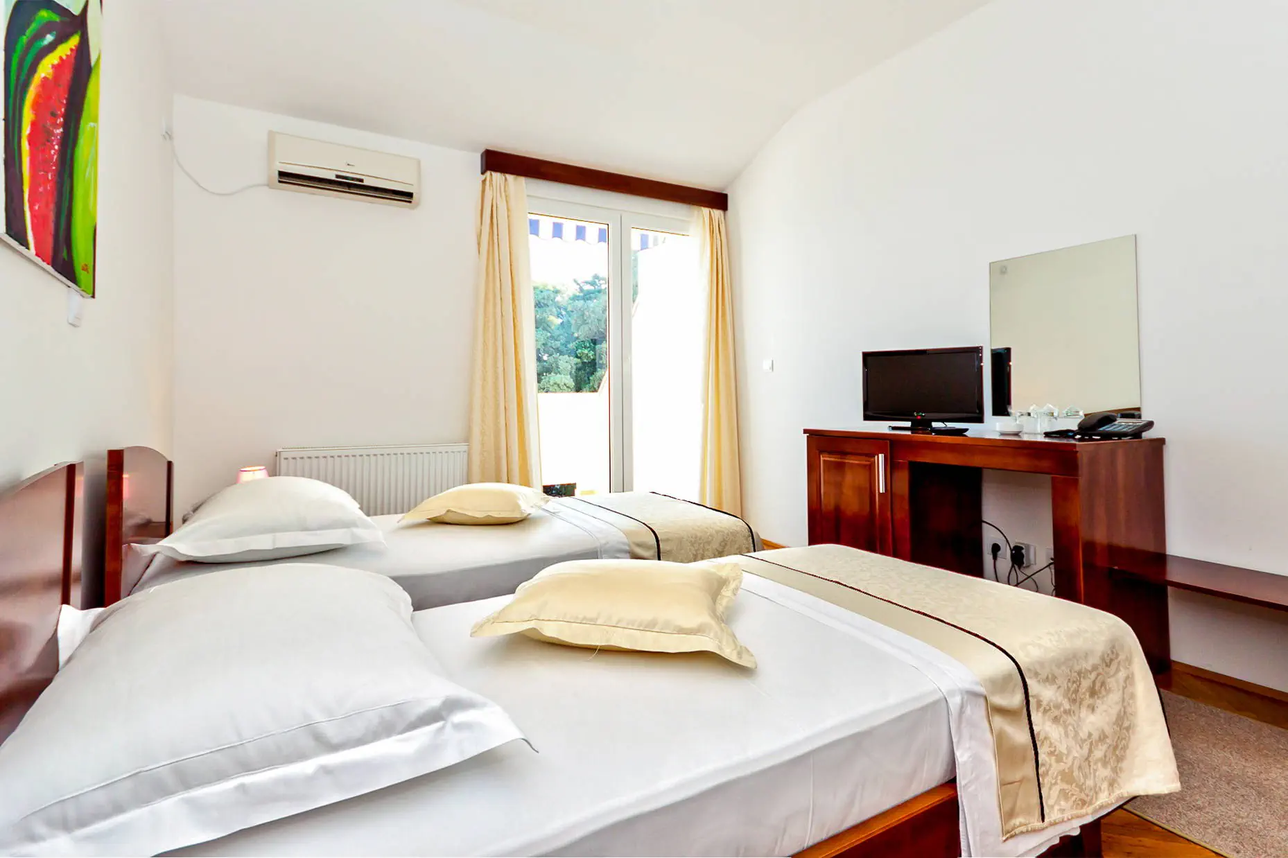 Hotele posiada 34 wygodnie i gustownie urządzonye pokoje 2-osobowe (możliwość 1 dostawki w formie rozkładanego łóżka) z balkonami i łazienkami. W pokojach znajdują się: TV-sat, klimatyzacja (centralnie sterowania, bezpłatna), sejf (bezpłatny), mini bar (dodatkowo płatny).