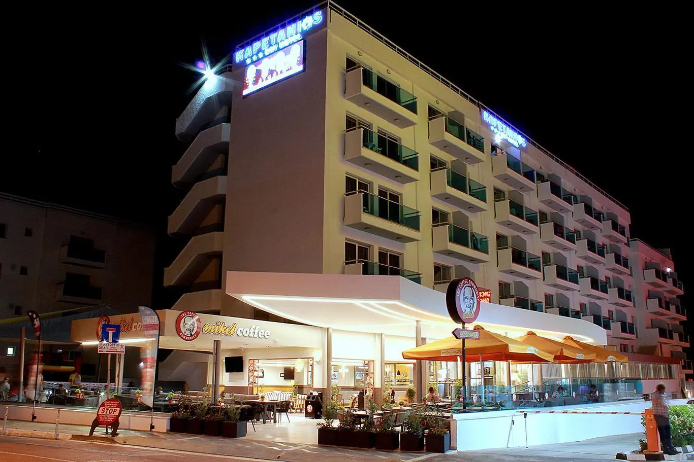 Hotel wzniesiony został w roku 1987. Obiekt oferuje łącznie 146 pokoi. Do dyspozycji gości jest lobby wraz z recepcją z check-out-service. Większość pięter osiągalna jest za pomocą windy. Na miejscu znajduje się przechowalnia bagażu, sejf i kantor wymiany walut. Wi-Fi w pomieszczeniach ogólnodostępnych zapewnia stały dostęp do sieci. Pomocą w rezerwacji wycieczek służy Państwu nasz tour-desk. Do dyspozycji gości jest restauracja i bar. Udane zakupy zrealizujecie Państwo w supermarkecie i sklepie z pamiątkami oraz w pozostałych placówkach handlowych. W obrębie obiektu znajduje się malowniczy ogród i plac zabaw. Do Państwa dyspozycji jest również sala telewizyjna i pokój zabaw dla dzieci. Auto pozostawić można w garażu oraz na parkingu. Do pozostałych oferowanych na miejscu usług należą: wielojęzyczny personel, opieka medyczna, serwis pokojowy, pobudka na życzenie i pralnia. Wsparciem w sferze biznesowej jest faks.Pokoje - Kapetanios Bay