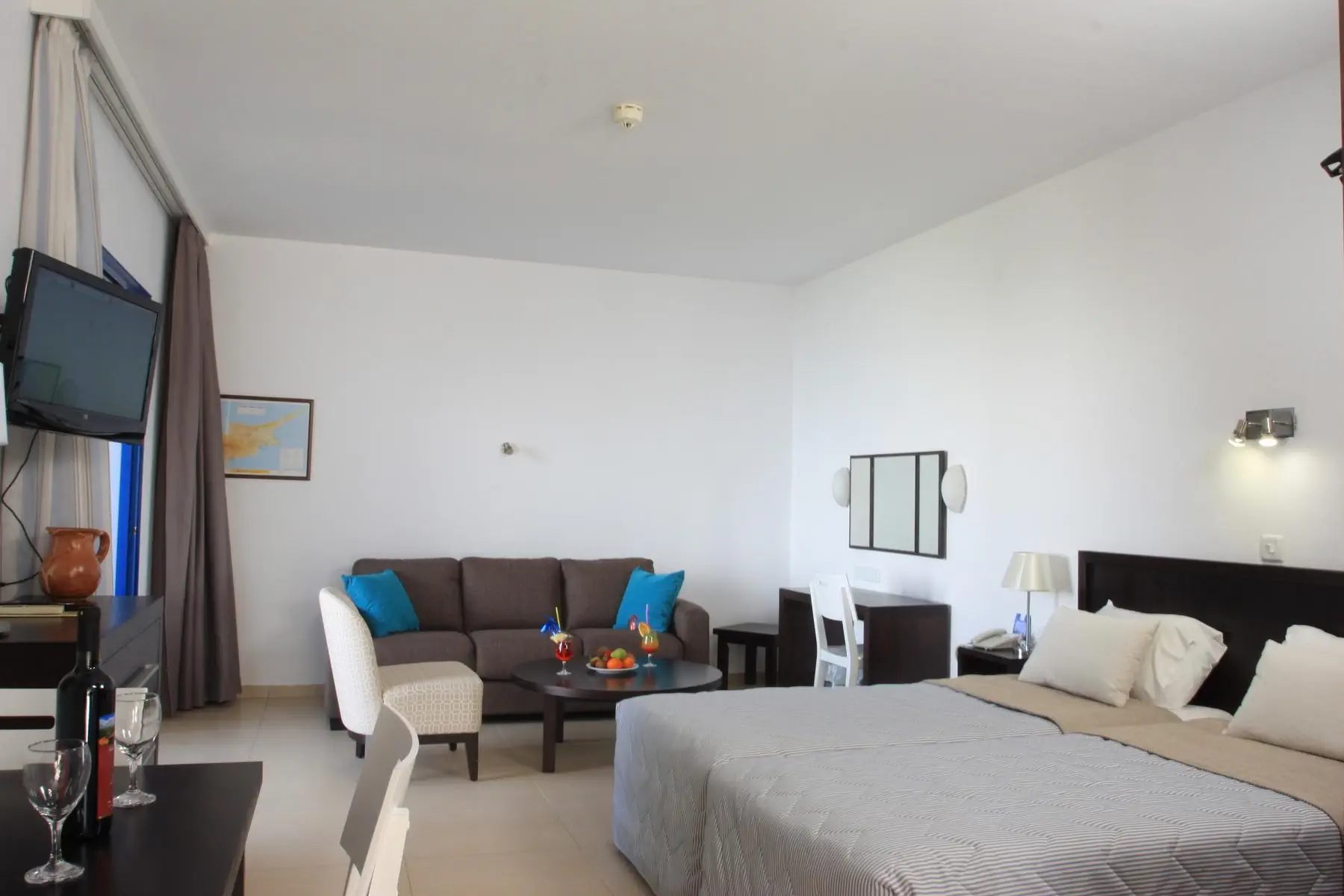 1 Bedroom Standard Balcony or Terrace (AP) - sypialnia, salon z aneksem kuchennym, łazienka, klimatyzacja, lodówka, telefon, internet Wi-Fi, sejf, kuchenka mikrofalowa, żelazko i deska do prasowania (na życzenie), telewizja satelitarna, czajnik, toster, balkon lub weranda. Powierzchnia - ok. 45 m kw. Standard Balcony or Terrace (Studio) - sypialnia z aneksem kuchennym, łazienka, lodówka, telefon, internet Wi-Fi, piekarnik, klimatyzacja, sejf, czajnik, toster, kuchenka mikrofalowa, telewizja satelitarna, żelazko (na życzenie), balkon lub weranda. Powierzchnia - ok. 35 m kw.Wyżywienie - MarisMare Apartments