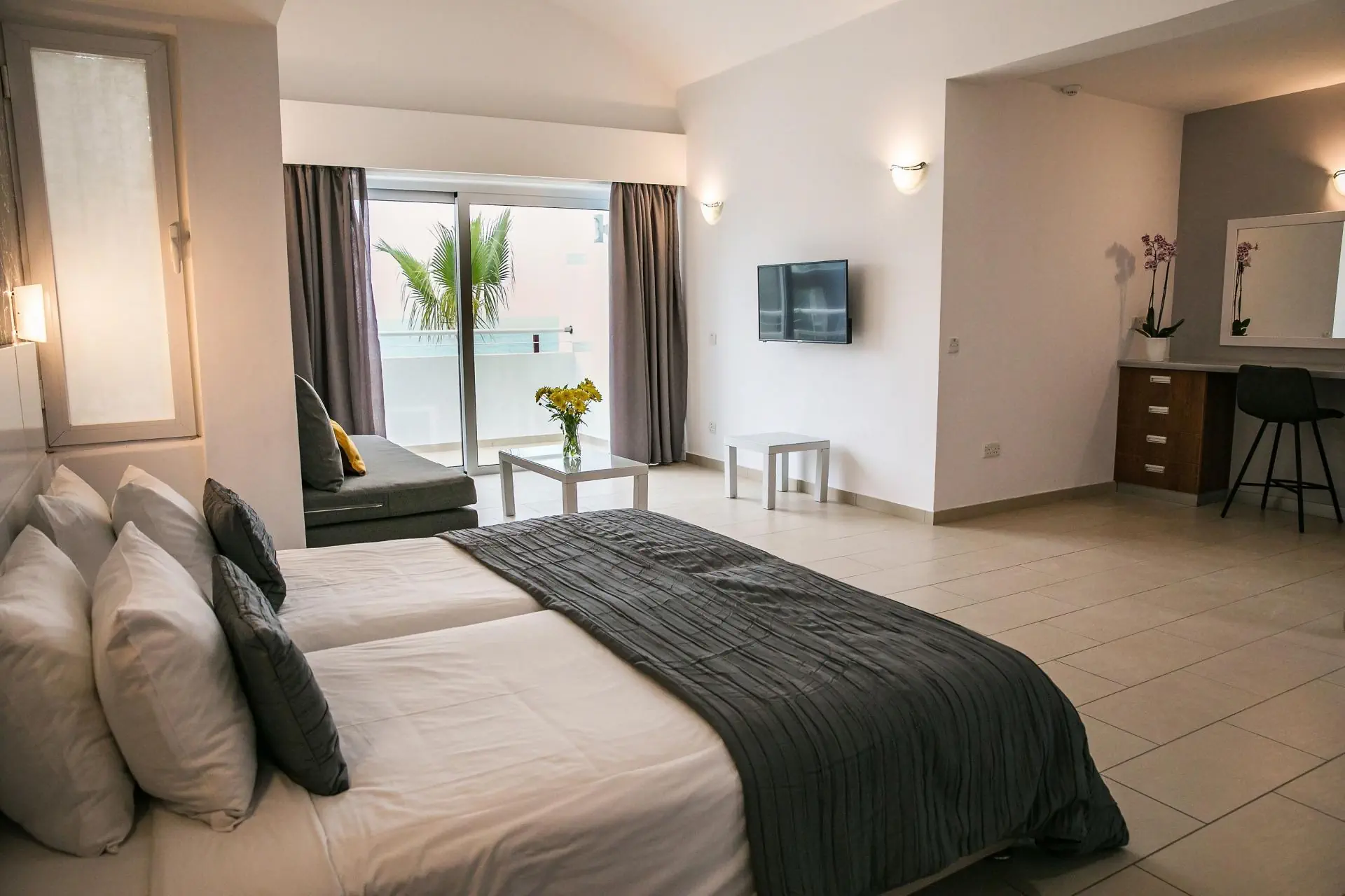 Serdecznie zapraszamy naszych gości do łącznie 72 pokoi. Na miejscu znajduje się przechowalnia bagażu i bankomat. Wi-Fi (bezpłatnie) zapewnia gościom stały dostęp do internetu. Pomocą w rezerwacji wycieczek służy Państwu nasz tour-desk. Ośrodek wypoczynkowy dysponuje szeregiem udogodnień dla niepełnosprawnych. Na urozmaiconą ofertę gastronomiczną składają się restauracja, kawiarnia i bar. W sklepie z pamiątkami nabyć można drobiazgi upamiętniające pobyt. Dzieci mogą bawić się do woli na placu zabaw. Na potrzeby naszych gości udostępniamy garaż oraz parking (bezpłatnie). Do pozostałych świadczonych usług należą wielojęzyczny personel, opieka nad dziećmi, wypożyczalnia samochodów, opieka medyczna, transfer hotelowy, serwis pokojowy, pobudka na życzenie i pralnia. Podróżnych preferujących zapoznanie się z okolicą w sposób aktywny ucieszy z pewnością możliwość wypożyczenia rowerów. Wsparciem w sferze biznesowej jest faks.Pokoje - Theo Sunset Bay Holiday Village