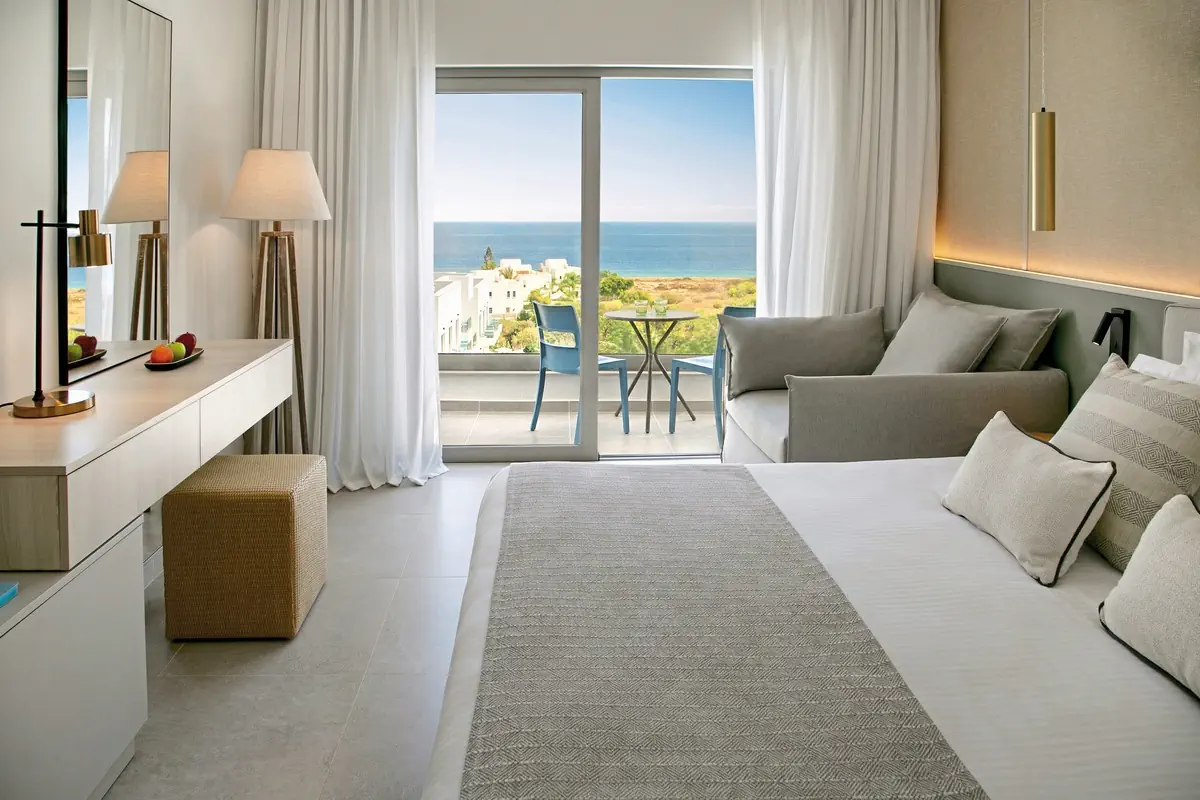 21-25 m², podwójny, superior, widok na ląd, łóżko podwójne (king size), 1 łóżko rozkładane, kabina prysznicowa bez brodzika, WC, szlafrok kąpielowy, kapcie kapielowe, suszarka do włosów, mini lodówka, sejf, TV, czajnik, ekspres do kawy, kawa/herbata, balkon (umeblowany), menu poduszkowe, w dniu przyjazdu w pokoju owoce, wodaDoppelzimmer Superior Meerblick (DSM) - Atlantica Aqua Blue