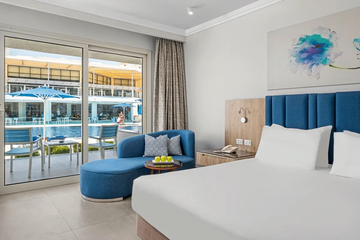 41-45 m², podwójny, deluxe, piętro, najniższy, 1., 2., widok na basen, Pościel, ręczniki i materace wykonane w 100% z bawełny organicznej, kącik wypoczynkowy, łóżka podwójne (1 łóżko podwójne lub 2 łóżka pojedyncze), prysznic, szlafrok kąpielowy, kapcie kapielowe, suszarka do włosów, klimatyzacja, minibar, wypełnienie codziennie, napoje bezalkoholowe, woda, sejf, TV, czajnik, kawa/herbata, balkon lub taras (umeblowany), zniżka na zabiegi spa, w dniu przyjazdu w pokoju wypieki (ciastka)Doppelzimmer Deluxe Meerblick (DDM) - Hotel: Pickalbatros Blu Spa