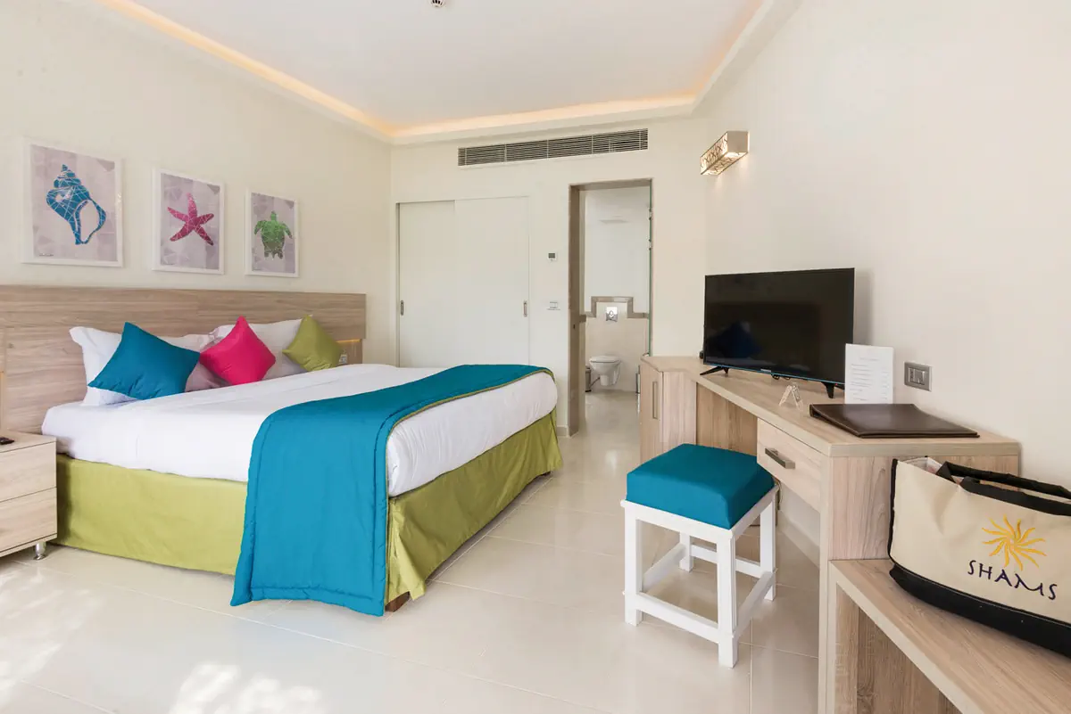 61-70 m², bungalow, łączone drzwiami, widok na morze (boczny), kącik wypoczynkowy, biurko, łóżka podwójne (1 łóżko podwójne lub 2 łóżka pojedyncze), 2 łazienki, zestaw prysznicowy, prysznic zewnętrzny, szlafrok kąpielowy, kapcie kapielowe, suszarka do włosów, lusterko kosmetyczne, klimatyzacja, minibar płatne, mini lodówka, sejf, TV, kawa/herbata, taras (umeblowany), w dniu przyjazdu w pokoju wodaWyżywienie - Shams+Lodge