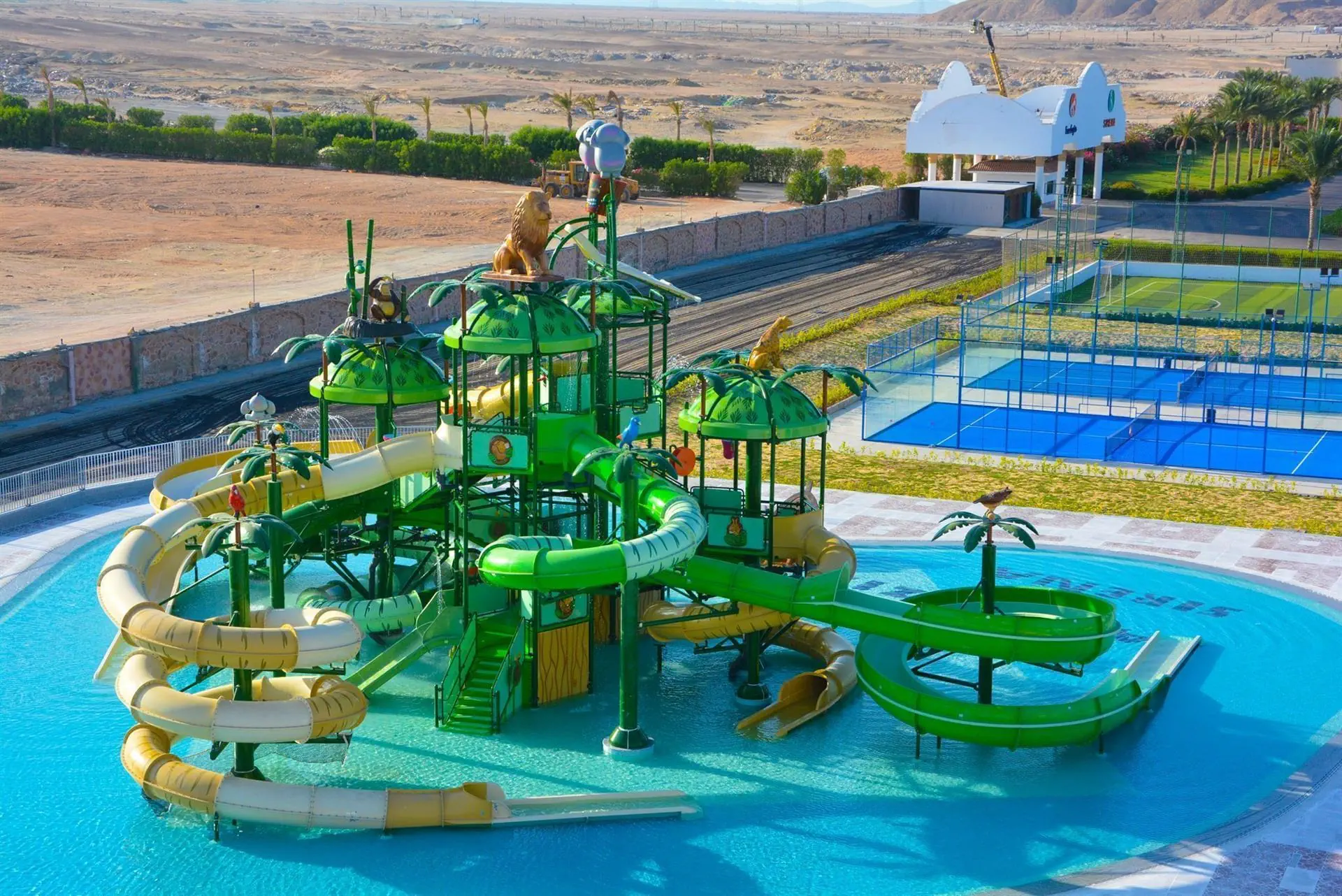 resortowy hotel, posiada 328 pokoi zlokalizowanych w 2-piętrowych budynkach, do dyspozycji gości; lobby z recepcją, główna restauracja w formie bufetu, restauracja a la carte (płatna, otwarta tylko w sezonie letnim), 2 bary na plaży, 2 bary przy basenach (1 tylko dla dorosłych), lobby bar, disco bar, sala konferencyjna, centrum SPA, 2 baseny dla dzieci (podgrzewane sezonowo), park wodny z 28 zjeżdżalniami (podgrzewany sezonowo), basen zewnętrzny tylko dla dorosłych (podgrzewany sezonowo), 4 baseny zewnętrzne (1 podgrzewany sezonowo), leżaki i parasole przy basenie, ręczniki plażowe (bezpłatnie).