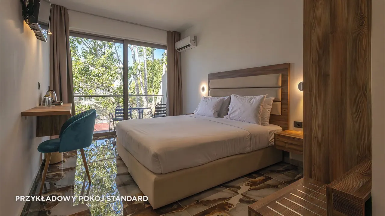 Standard• 2 os.• klimatyzacja• TV-SAT, telefon• Wi-Fi (bezpłatne)• sejf• mini lodówka• łazienka: wanna/prysznic, suszarka, zestaw kosmetyków• balkon• pokój Standard z widokiem na basen za dopłatąSuperior• 2-3 os.• dostawka dla 3. osoby• wyposażony jak pokój Standard• pokój Superior z widokiem na basen za dopłatąRodzinny• 2-4 os.• dostawka dla 1. i 2. dziecka (łóżko piętrowe)• wyposażony jak pokój StandardMaisonette• 2-4 os.• dostawka dla 3. i 4. osoby• 2 pomieszczenia oddzielone drzwiami przesuwnymi• wyposażony jak pokój StandardDostępne typy pokoi - Blue Waters