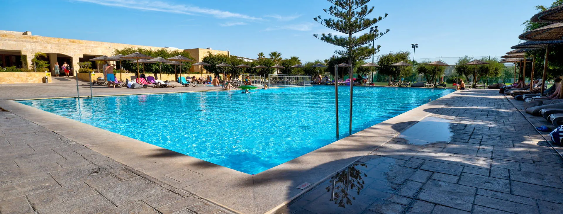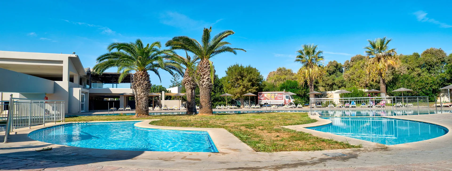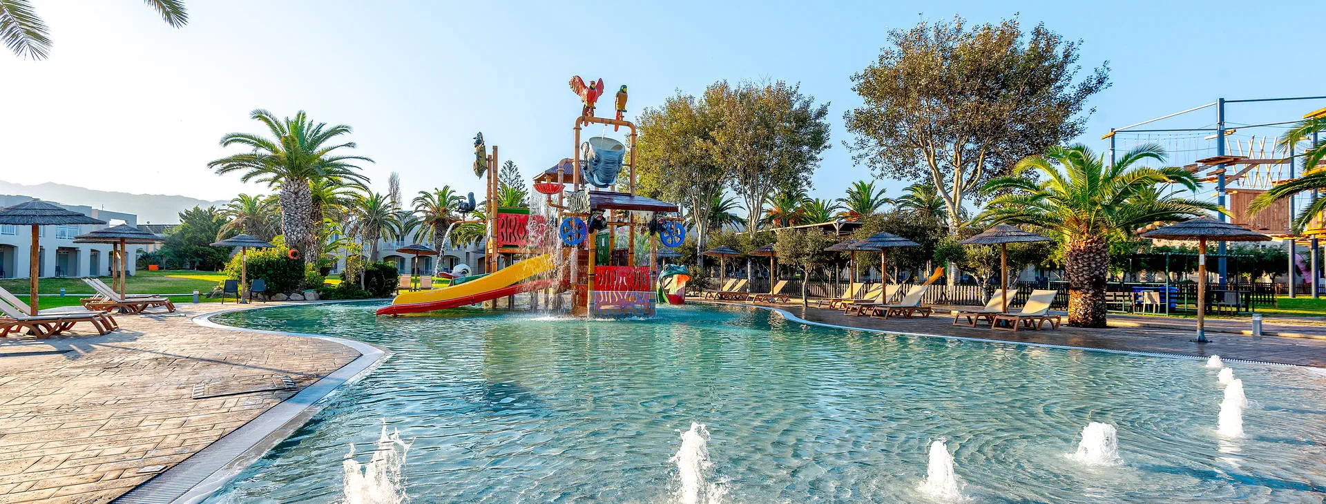 Dla dzieci: 3 odkryte baseny przyjazne dzieciom z atrakcjami wodnymi, plac zabaw, mini boisko do piłki nożnej, karaoke dla dzieci, kolorowe pokazy prowadzone przez animatorów.