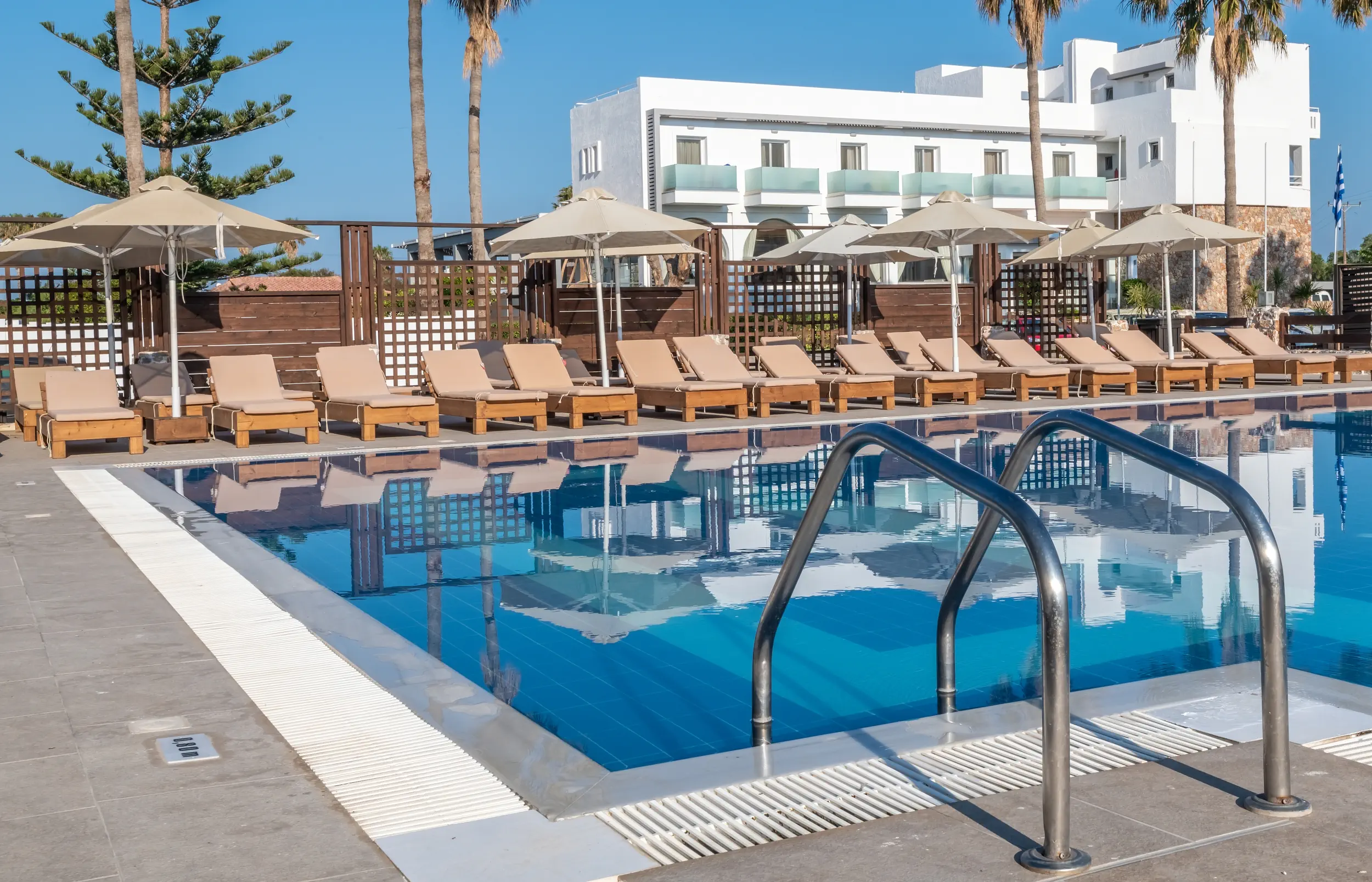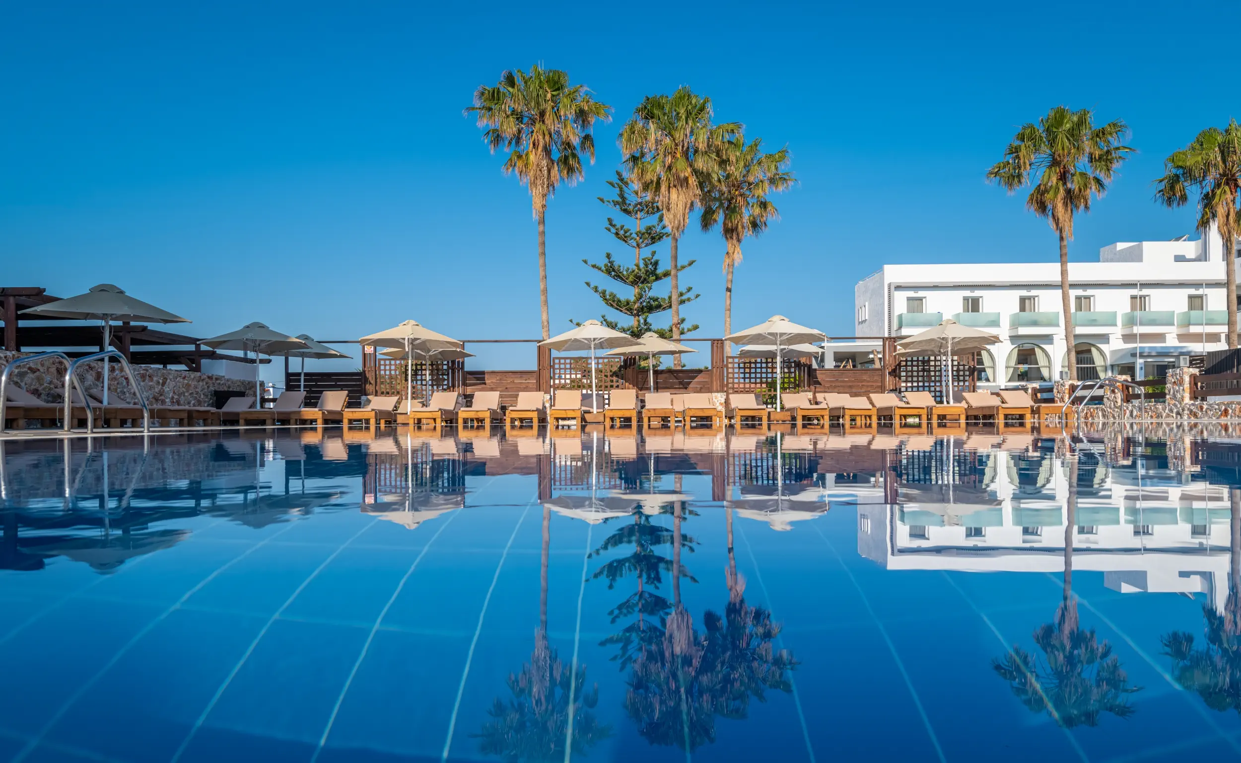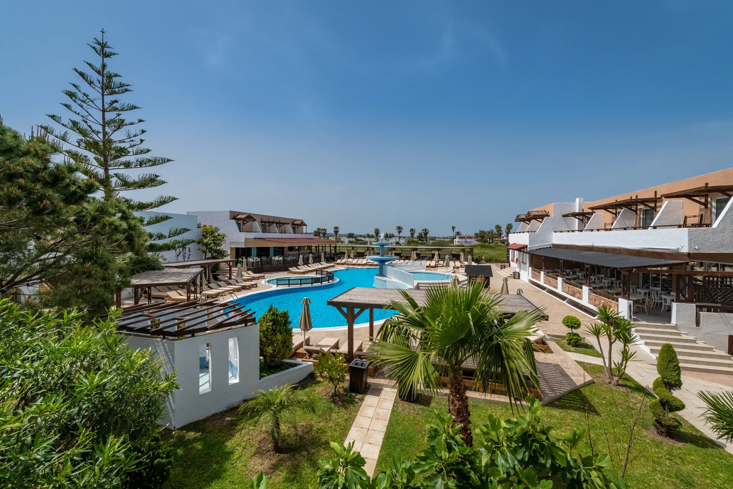 Śniadanie (07:30 - 10:00) - MAIN RESTAURANT , stół szwedzki, Obiad (12:30 - 14:30) - MAIN RESTAURANT , stół szwedzki, Kolacja (18:30 - 21:00) - MAIN RESTAURANT , stół szwedzki, napoje bezalkoholowe, alkohole lokalne, wybrane alkohole importowane ¹⁾, lody ¹⁾ ¹⁾ - dodatkowo płatneDOUBLE ROOM GARDEN VIEW OR POOL VIEW WITH BALCONY OR TERRACE - Gaia Village