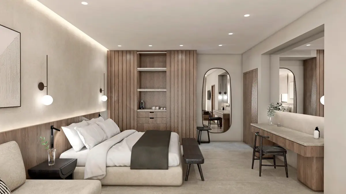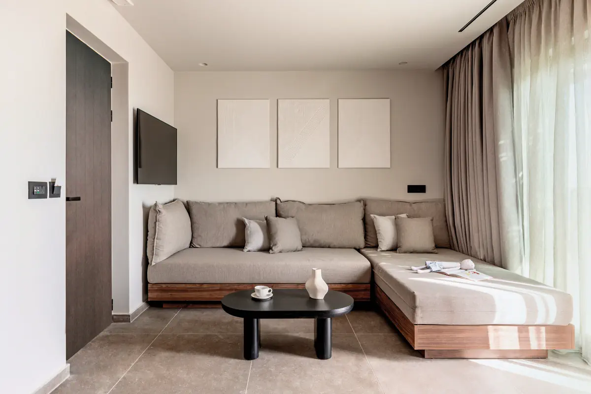 36-40 m², junior suite, optycznie oddzielony salon/sypialnia, 1 łazienka, prysznic, kabina prysznicowa bez brodzika, WC, suszarka do włosów, klimatyzacja, indywidualnie sterowana, sejf, TV (satelitarna, płaski ekran), czajnik, lodówka, balkon lub taras (umeblowany), Wysokiej klasy kosmetyki kąpieloweSuite (WB1) - Elios Hill
