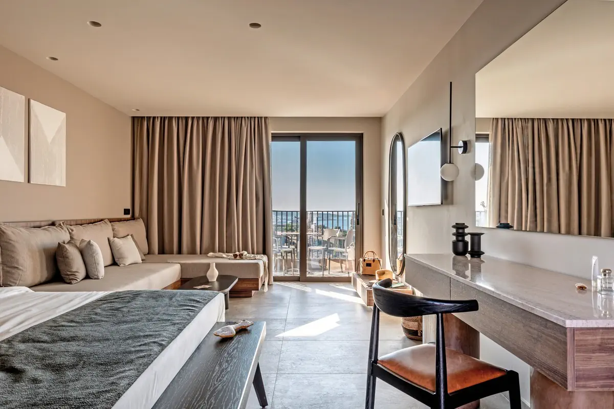31-35 m², rodzinny, optycznie oddzielony salon/sypialnia, 1 łazienka, prysznic, kabina prysznicowa bez brodzika, WC, suszarka do włosów, klimatyzacja, indywidualnie sterowana, sejf, TV (satelitarna, płaski ekran), czajnik, lodówka, balkon lub taras (umeblowany), Wysokiej klasy kosmetyki kąpieloweJuniorsuite (JB1) - Elios Hill