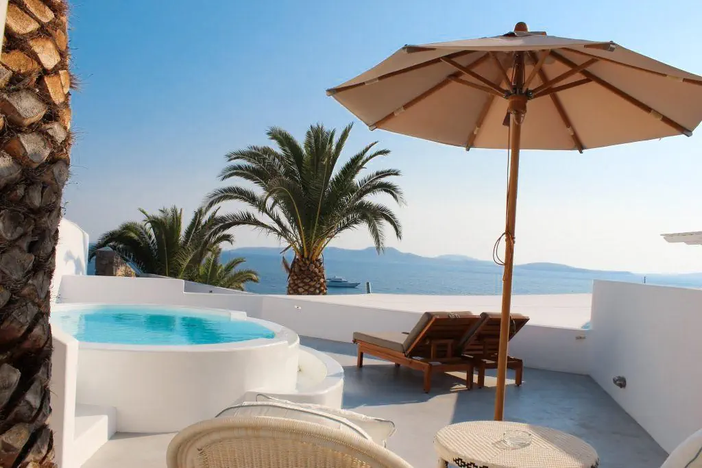 Pokoje wyposażone są w klimatyzację, kuchnię i łazienkę. Balkon lub taras należą do standardowego wyposażenia większości pokoi. Urzekającą atmosferę wielu kwater podkreśla widok na morze. Pomieszczenia mieszkalne i sypialne wyposażone są w łóżko podwójne bądź łóżko typu queen size. Istnieje możliwość dostawki. Ponadto skorzystać można z sejfu, minibarku i biurka. W skład standardowego wyposażenia wchodzi również lodówka. Elementami podwyższającymi komfort pobytu są internet, telefon, telewizor, radio, zestaw stereo i Wi-Fi (bezpłatnie). Łazienki wyposażone są w prysznic i wannę. W łazience znajduje się suszarka do włosów i telefon. Obiekt oferuje pokoje dla niepalących.Oferta sportowo-rozrywkowa - Manoulas Beach (Mykonos)