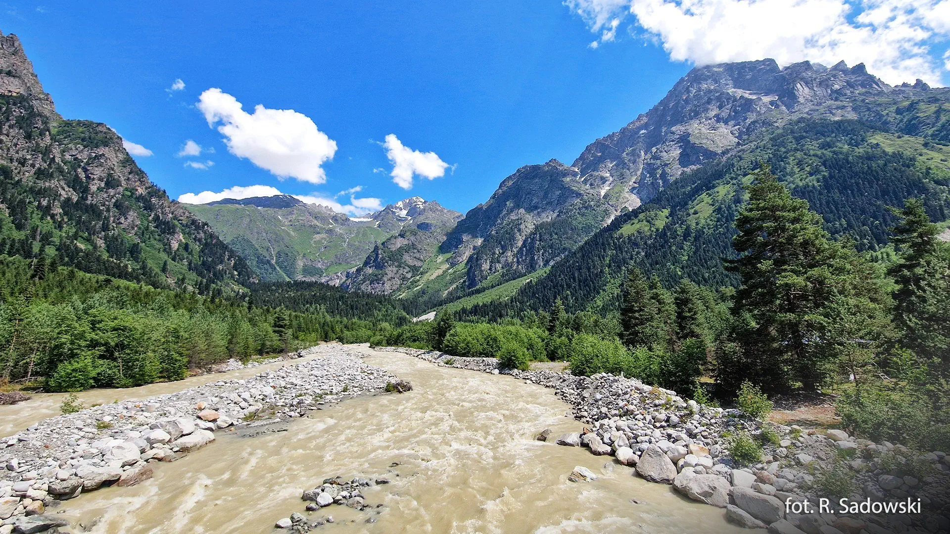 Śniadanie, wykwaterowanie. Przejazd do ZHABESHI (czas przejazdu ok. 30 min), trekking do wioski ADISHI (ok. 2030 m n.p.m.), po drodze piękny panoramiczny widok na ogromną dolinę rzeki Inguri i okoliczne lodowe szczyty. Zakwaterowanie, kolacja i nocleg w pensjonacie w Adishi. Szacowany czas przejścia ok. 6 godz.