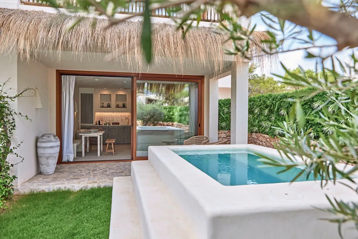 21-25 m², studio, widok na ogród, widok na ląd, 1 łazienka, prysznic, suszarka do włosów, klimatyzacja, sejf, 1 TV (satelitarna, płaski ekran), Wi-Fi, czajnik, mikrofalówka, ekspres do kawy, lodówka, taras (umeblowany), prywatny basenSuite mit privatem Pool (WBG) - Mar Suites Formentera By Universal Beach