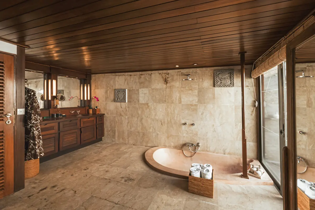 91-100 m², suita, przy plaży, widok na morze, Pościel, ręczniki i materace wykonane w 100% z bawełny organicznej, kącik wypoczynkowy, prysznic, wanna, prysznic zewnętrzny, oddzielne WC, szlafrok kąpielowy, suszarka do włosów, klimatyzacja, wentylator, minibar płatne, sejf, TV (płaski ekran), głośnik bluetooth, taras (umeblowany), ogródOne Bedroom Deluxe Pool Villa (VD5) - Jimbaran Puri Bali
