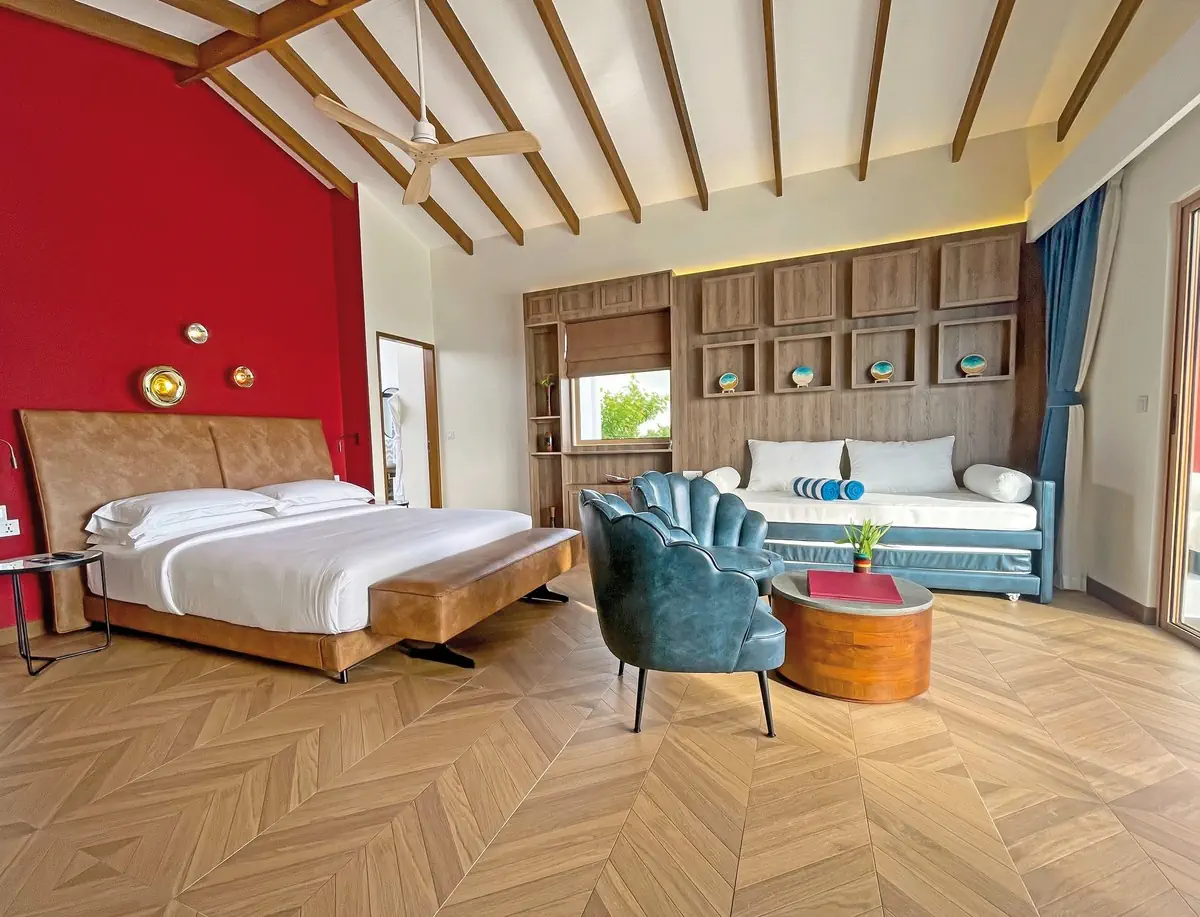 91-100 m², suita, wolnostojący, od strony zachodu słońca, bungalow na wodzie (uniesiony nad laguną), widok na morze, połączony pokój dzienny i sypialnia, prysznic, wanna, WC, szlafrok kąpielowy, suszarka do włosów, klimatyzacja, wentylator, minibar, wypełnienie codziennie, napoje bezalkoholowe, piwo, wino domowe, woda, TV, Wi-Fi, czajnik, ekspres do kawy, kawa/herbata, taras (umeblowany), bezpośredni dostęp do morza, prywatny basenFamily Beach Villa (FB1) - Joy Island Maldives