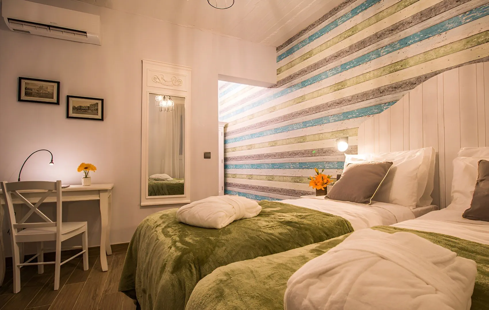 standardowy - 2-os. (możliwość 1 dostawki dla dziecka) - ok. 14-16 m² - indywidualnie sterowana klimatyzacja - łazienka (prysznic, wc, suszarka, szlafroki i kapcie) - internet bezprzewodowy - telewizor - telefon - sejf - zestaw do kawy/herbaty - woda uzupełniana codziennie - za opłatą: minibar (płatny wg konsumpcji) standardowy z balkonem lub tarasem - 2-os. (możliwość 1 dostawki dla dziecka) - ok. 16 m² - indywidualnie sterowana klimatyzacja - łazienka (wanna lub prysznic, wc, suszarka, szlafroki i kapcie) - internet bezprzewodowy - telewizor - telefon - sejf - zestaw do kawy/herbaty - woda uzupełniana codziennie - balkon lub taras (stolik i krzesełka) - za opłatą: minibar (płatny wg konsumpcji) standardowy z jacuzzi - 2-os. - ok. 16 m² - indywidualnie sterowana klimatyzacja - łazienka (prysznic, wc, suszarka, szlafroki i kapcie) - internet bezprzewodowy - telewizor - telefon - sejf - zestaw do kawy/herbaty - woda uzupełniana codziennie - taras (stolik, krzesełka i leżaki) z jacuzzi i prysznicem - za opłatą: minibar (płatny wg konsumpcji) studio - 2-os. (możliwość 1 dostawki dla dziecka) - ok. 48 m² - w budynku bocznym - indywidualnie sterowana klimatyzacja - łazienka (prysznic, wc, suszarka, szlafroki i kapcie) - pokój dzienny i sypialnia na osobnych piętrach - wyposażony aneks kuchenny - internet bezprzewodowy - telewizor - telefon - sejf - zestaw do kawy/herbaty - woda uzupełniana codziennie - zestaw do prasowania - pralka - balkon (stolik i krzesełka) - za opłatą: minibar (płatny wg konsumpcji)Wyżywienie - De Rohan