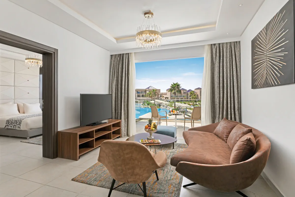 26-30 m², podwójny, premium, widok na basen, prysznic, WC, suszarka do włosów, klimatyzacja, mini lodówka, sejf, TV, ekspres do kawy, balkon lub taras, bezpośrednie wejście do basenu, dzielony basenDoppelzimmer Meerblick mit Relaxpool (D3Q) - White Beach Resort Taghazout By Pickalbatros