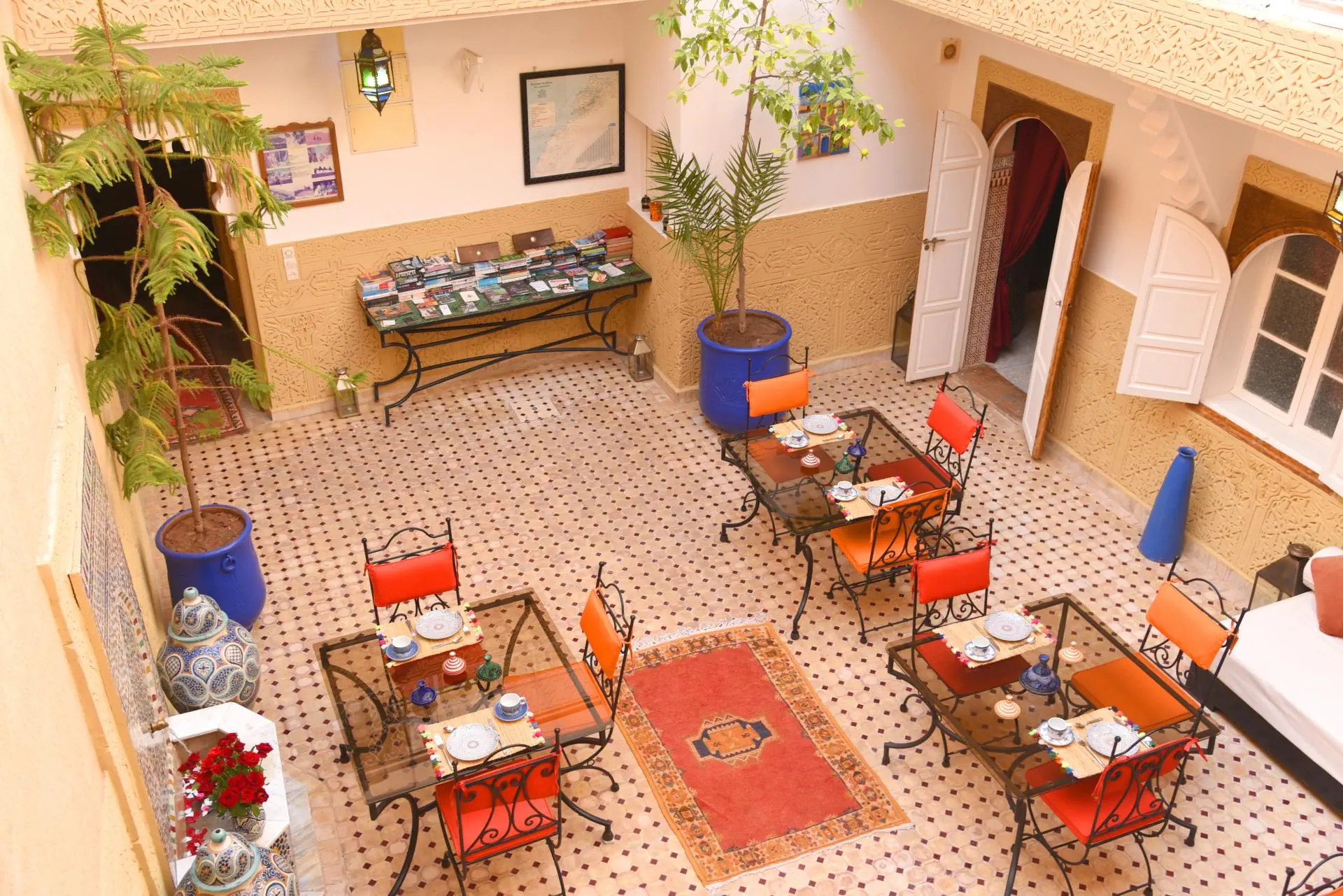 Recepcja, tradycyjny marokański salon, taras słoneczny na dachu i wewnętrzne patio na którym serwowane są posiłki.