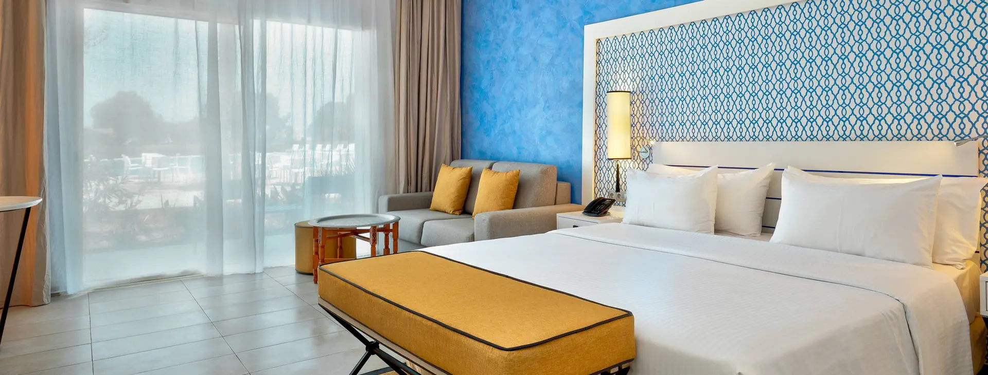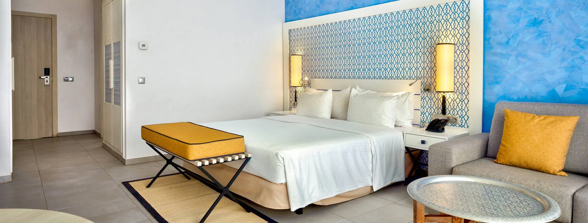 Obiekt dysponuje 100 pokojami typu superior oraz premium i 50 suitami z elementami wystroju w stylu marokańskim. Pokój superior oraz premium (39m2) oferują przestronne i wygodne wnętrza. Dodatkowo w ofercie znajduje się Family Room z dwoma pokojami łączonymi (39m2). Na wyposażenie pokoju składa się umeblowany taras, TV-Sat, telefon, indywidualnie sterowana klimatyzacja, minibar, duża szafa, sejf oraz łazienka z prysznicem lub wanną, suszarką, lustro do makijażu i zestaw kosmetyków do kąpieli.