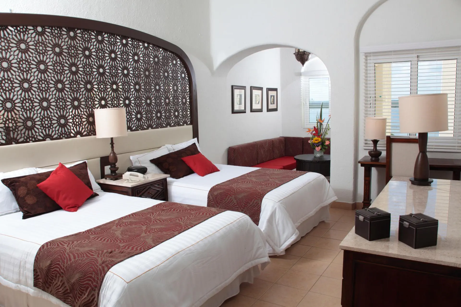 Double deluxe - elegancki pokój dwuosobowy z widokiem na teren hotelowy; sypialnia, marmurowa łazienka (prysznic, suszarka, szlafroki), 32-calowy telewizor z płaskim ekranem/TV sat, ekspres do kawy, sejf, żelazko, telefon, minilodówka, klimatyzacja, wentylator sufitowy, stacja dokująca do iPoda, Wi-Fi. Powierzchnia - ok. 33 m kw. Deluxe lagoon view - elegancki pokój z widokiem na lagunę. Wyposażenie jak w double deluxe. Deluxe ocean view - elegancki pokój z widokiem na morze. Wyposażenie jak w double deluxe.Wyżywienie - GR Caribe By Solaris