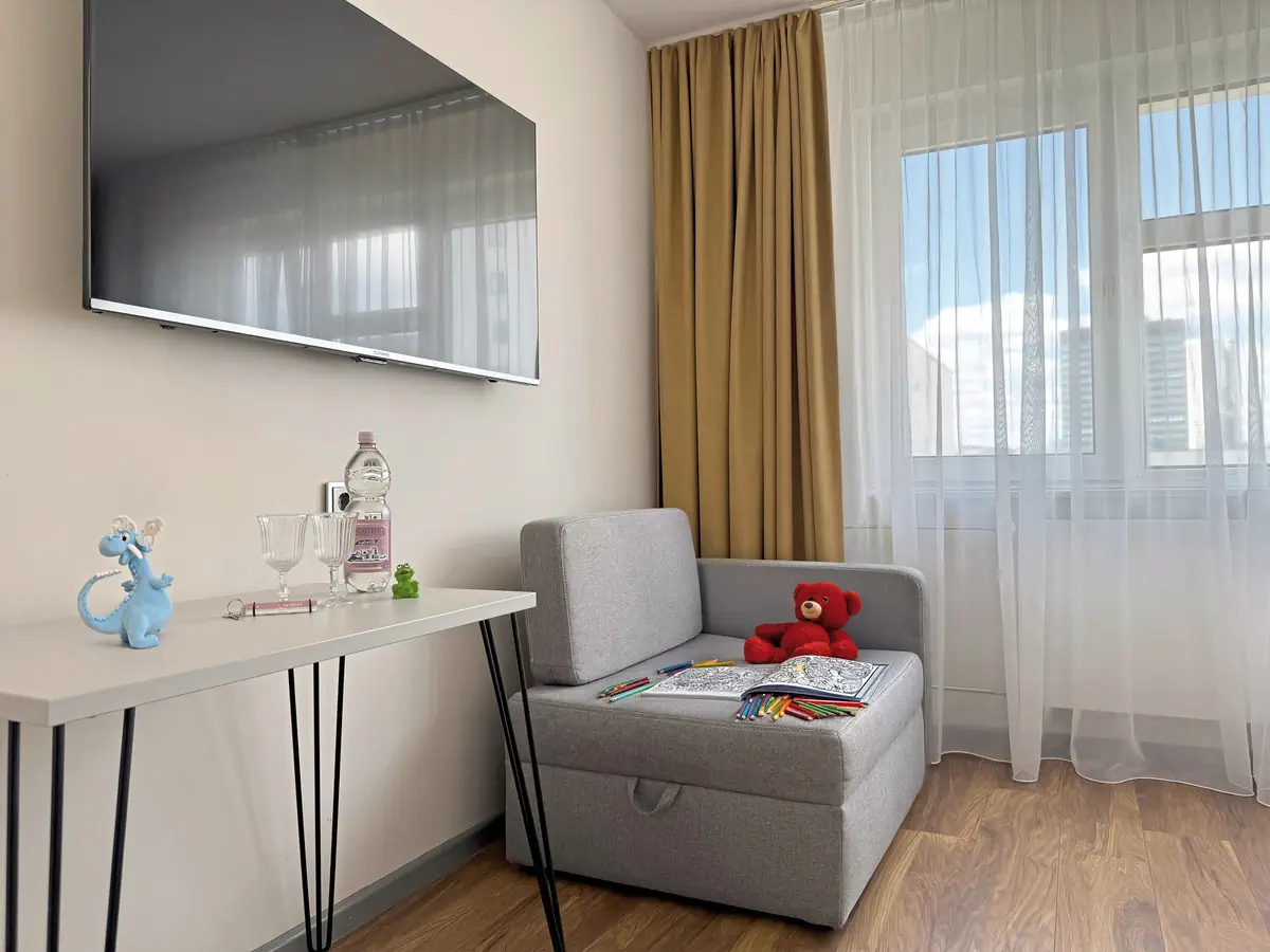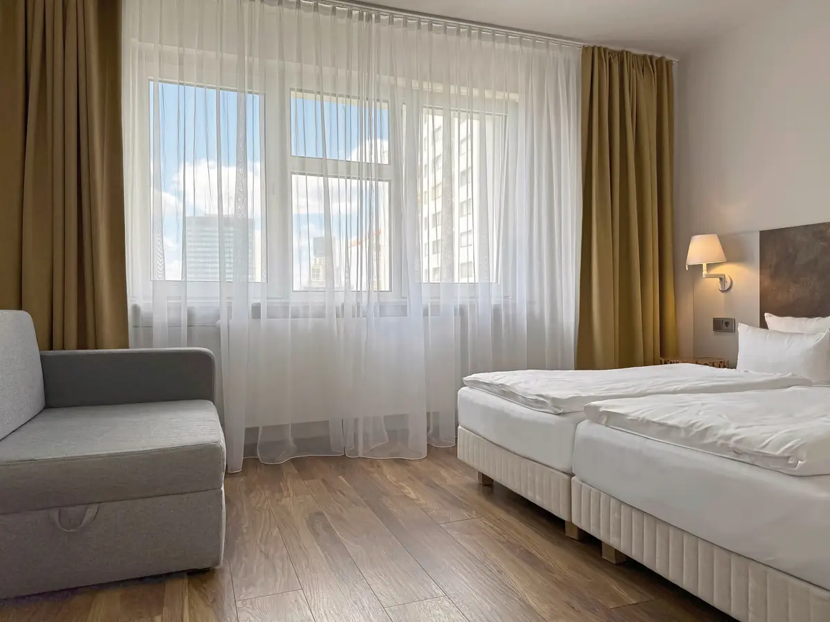 21-25 m², rodzinny, kącik wypoczynkowy, łóżko podwójne, łóżko rozkładane, prysznic, WC, suszarka do włosów, TV, Wi-Fi, czajnik, kawa/herbata, w dniu przyjazdu w pokoju wodaWyżywienie - SORAT Hotel Berlin