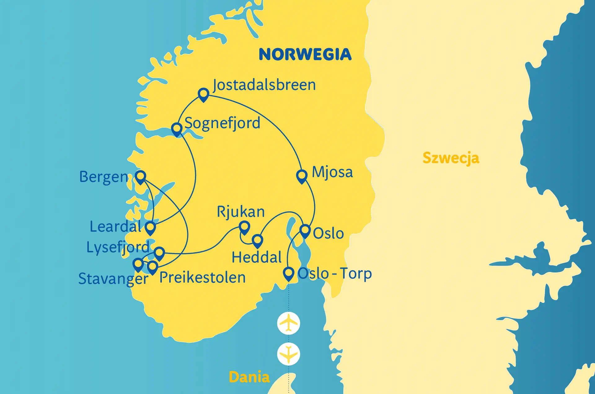 Dzień 1 Zbiórka przy stanowiskach odpraw Rainbow Tours na 2 godziny przed wylotem samolotu do Oslo-Torp na poszczególnych lotniskach. Aktualne rozkłady prosimy sprawdzać na: www.rainbowtours.pl/rozklady. Po przylocie transfer do hotelu w okolicy Drammen/Kongsberg. Zakwaterowanie i czas wolny. (doba hotelowa rozpoczyna się ok. godziny 16:00). Tego dnia nie ma kolacji (dotyczy Klientów, którzy wykupili pakiet kolacji). (Trasa ok. 80 km) Dzień 2 Po śniadaniu, wykwaterowanie i przejazd w kierunku regionu Telemark – zwanego często „Norwegią w miniaturze” ze względu na różnorodność krajobrazów: od gór i płaskowyżu po jeziora i doliny. W Heddal zwiedzanie największego w Norwegii drewnianego kościoła słupowego z XIII wieku – imponującej świątyni, która mimo upływu wieków nadal służy jako kościół parafialny. Następnie przejazd do Rjukan – miasta powstałego na początku XX wieku specjalnie na potrzeby przemysłu. Zwiedzanie położonego wysoko nad doliną Muzeum Vemork, mieszczącego się w dawnej elektrowni wodnej. To tutaj, podczas II wojny światowej, norwescy sabotażyści przeprowadzili jedną z najsłynniejszych akcji dywersyjnych w Europie, niszcząc instalację produkującą tzw. ciężką wodę – niezbędną w niemieckim programie atomowym. Po zwiedzaniu przejście piesze przez historyczny wąwóz do miejsca, gdzie przeprowadzono operację – trasa prowadzi przez most i ścieżkę z widokami na dolinę Rjukan i budynek elektrowni. Po zakończeniu spaceru przejazd do miejscowości Vrådal. Zakwaterowanie, obiadokolacja (wliczona w cenę) i nocleg. (Trasa ok. 350 km) Dzień 3 Po śniadaniu, wykwaterowanie i przejazd w kierunku Stavanger. Po drodze zobaczymy pomnik Trzech Mieczy – upamiętniający bitwę w Hafrsfjord w 872 r. podczas której Harald Pięknowłosy pokonał swych rywali i po raz pierwszy zjednoczył Norwegię w jedno królestwo. Wizytę w Stavanger rozpoczniemy od rejsu po fiordzie Lysefjord, wśród gór o wysokości nierzadko przekraczającej 1000 m, opadających niemal pionowo do zatoki. Podczas rejsu zobaczymy z dołu słynną półkę skalną Preikestolen (Ambona). Następnie spacer po Stavanger z lokalnym przewodnikiem - zobaczymy urzekającą starówkę z białymi drewnianymi domkami, małymi ogródkami pełnymi kwiatów i brukowanymi uliczkami wspinającymi się po uroczych pagórkach, zbudowaną z szarego kamienia w 1125 r. Katedrę Stavanger Domkirke i buzujące życiem oraz kolorami centrum Stavanger. Przejazd do hotelu, zakwaterowanie, obiadokolacja (dotyczy Klientów, którzy wykupili pakiet kolacji) i nocleg (Trasa ok. 270 km). Dzień 4 Wczesne śniadanie, wykwaterowanie i wycieczka na najbardziej znany w Norwegii punkt widokowy Preikestolen czyli wysoki na ponad 600 m granitowy klif „wyrastający” stromo z wód Lyserfjordu. Po wejściu na półkę skalną zobaczymy spektakularny widok na fiordy i okoliczne góry. Wyjazd na wycieczkę wcześnie rano. Uwaga! Podejście na Preikestolen wymaga od uczestników stroju i obuwia odpowiedniego do wędrówek górskich! Trasa górska ok. 8 km. Dla osób, które nie chcą uczestniczyć w podejściu istnieje możliwość pozostania w Stavanger. Po południu wspólny przejazd trasą widokową w kierunku Bramy Fjordów czyli miasta Bergen. Na trasie dwie przeprawy promowe Mortavika – Arsvågen oras Halhjem – Sandvikvag. Zakwaterowanie w hotelu w okolicach Bergen, obiadokolacja (dotyczy Klientów, którzy wykupili pakiet kolacji) i nocleg. (Trasa ok. 220 km) Dzień 5 Po śniadaniu i wykwaterowaniu przejazd do Bergen, dawnego miasta kupieckiego, położonego nad zatoką pomiędzy siedmioma wzgórzami, które dziś rozrasta się na okoliczne wyspy i cyple. Zobaczymy wpisaną na listę UNESCO dzielnicę Bryggen czyli wybudowane jeden przy drugim, drewniane domy kupców hanzeatyckich zwrócone fasadami ku zatoce. W wąskich pasażach między zabudowaniami znajdziemy sklepiki, bary i restauracje. Nieopodal wznoszą się: romański kościół mariacki, w pobliżu portu duża twierdza Bergenhus, po przeciwnej zaś stronie zatoki najsłynniejszy w Norwegii targ rybny Torget ze świeżymi owocami morza. Wejście na wzgórze Fløyen z którego rozpościera się piękna panorama na Bergen i fiordy, zjazd słynną kolejką Fløibanen (osoby, które nie chcą uczestniczyć w podejściu, za dopłatą ok. 10 EUR/os, mogą pojechać kolejką w obie strony). Nastepnie czas wolny, a dla chętnych, za dodatkową opłatą wizyta w Barze Lodowym – z drinkiem alkoholowym lub bezalkoholowym do wyboru. Następnie przejazd do hotelu w okolicy Leardal. Zakwaterowanie, obiadokolacja (wliczona w cenę) i nocleg. (Trasa ok. 210 km) Dzień 6 Po śniadaniu, wykwaterowanie. Krótka przeprawa promowa z Fodnes do Manhaller przez najdłuższy i najgłębszy fiord Norwegii Sognefjord (ok. 204 km długości i 1300 metrów głębokości). Następnie przejazd w kierunku Jostadalsbreen – największego lodowca na kontynencie europejskim. Przeprawa łodzią przez jeziorko i spacer pod jeden z jęzorów lodowcowych (Uwaga! Podejście pod jęzor lodowca wymaga od uczestników stroju i obuwia odpowiedniego do wędrówek górskich). Po wizycie pod Nigardsbreen nasza trasa prowadzić będzie przez najwyższe pasmo górskie Norwegii - Joutunheim. Pojedziemy narodowym szlakiem turystycznym Sognefjell, który w najwyższym punkcie osiąga wysokość 1 434 m n.p.m. i prezentuje panoramę ośnieżonych szczytów górskich. Następnie malowniczą górską doliną Gudbrandsdalen dotrzemy na nocleg w hotelu w okolicy Ringebu, obiadokolacja (wliczona w cenę). (Trasa ok. 450 km) Dzień 7 Po śniadaniu, wykwaterowanie i przejazd wzdłuż największego jeziora norweskiego Mjosa do Oslo. Zwiedzanie Oslo z lokalnym przewodnikiem - Park Frogner, będący jednocześnie muzeum rzeźb Gustawa Vigelanda, przedstawiającymi wszystkie stadia ludzkiego życia. Objazd centrum miasta: główna ulica miasta - Karl Johans Gate, Pałac 