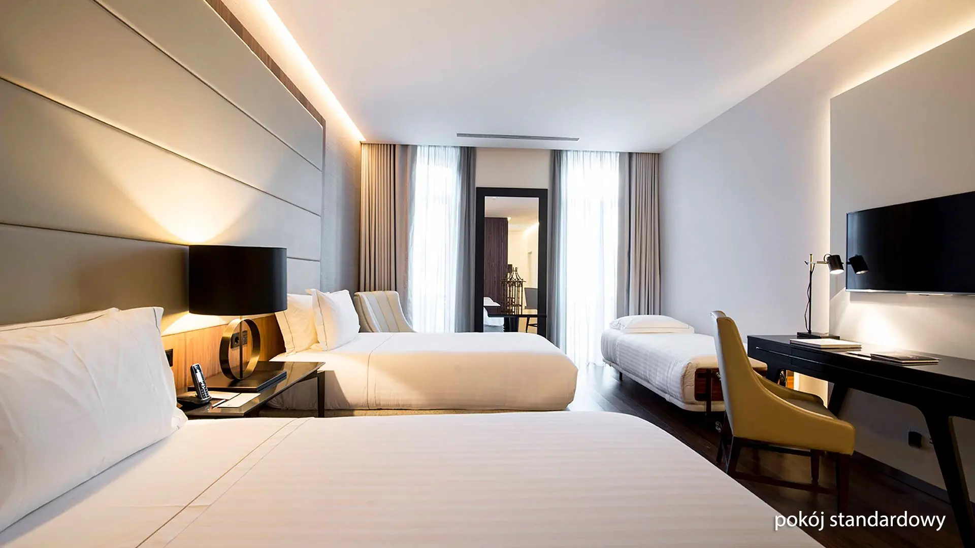 standardowy - 2-os. (możliwość 1 dostawki dla os. dorosłej lub 2 dostawek dla dzieci) - ok. 25-35 m2 - klimatyzowany - łazienka (prysznic, wc, suszarka, zestaw kosmetyków, szlafrok, kapcie) - internet bezprzewodowy - telewizja satelitarna - czajnik - sejf - minibar (płatny wg konsumpcji) - bezpłatne łóżeczko dla dziecka do 2 lat na zamówienie przed przyjazdem rodzinny - 2-os. (możliwość 2 dostawek dla dzieci) - ok. 50 m2 - wyposażenie jak w pokoju standardowym - dodatkowy pokój oddzielony optycznie - bezpłatne łóżeczko dla dziecka do 2 lat na zamówienie przed przyjazdem superior - 4-os (możliwość 1 dostawki dla dziecka) - ok. 45 m2 - wyposażenie jak w pokoju standardowym - dodatkowo wanna z hydromasażem - bezpłatne łóżeczko dla dziecka do 2 lat na zamówienie przed przyjazdemWyżywienie - Bessa