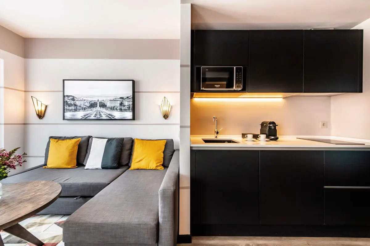 26-30 m², studio, deluxe, połączony pokój dzienny i sypialnia, biurko, łóżko podwójne, sofa, kabina prysznicowa bez brodzika, szlafrok kąpielowy, kapcie kapielowe, suszarka do włosów, klimatyzacja, sejf, TV, Wi-Fi, aneks kuchenny, czajnik, mikrofalówka, kawa/herbata, lodówka, w dniu przyjazdu w pokoju wodaJuniorsuite (JB1) - Pestana Lisboa Vintage City Center Suites