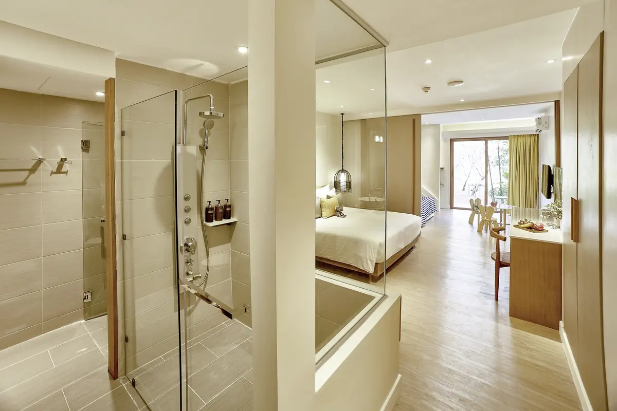 51-60 m², rodzinny, deluxe, parter, optycznie oddzielony salon/sypialnia, prysznic lub wanna, WC, suszarka do włosów, klimatyzacja, sejf, TV (satelitarna, programy lokalne, inne programy, płaski ekran), lodówka, taras (umeblowany), bezpośrednie wejście do basenu, liczba pokoi: 38, w dniu przyjazdu w pokoju Kosz owocówCourtyard Plunge Pool Villa (VB1) - Bandara Resort & Spa