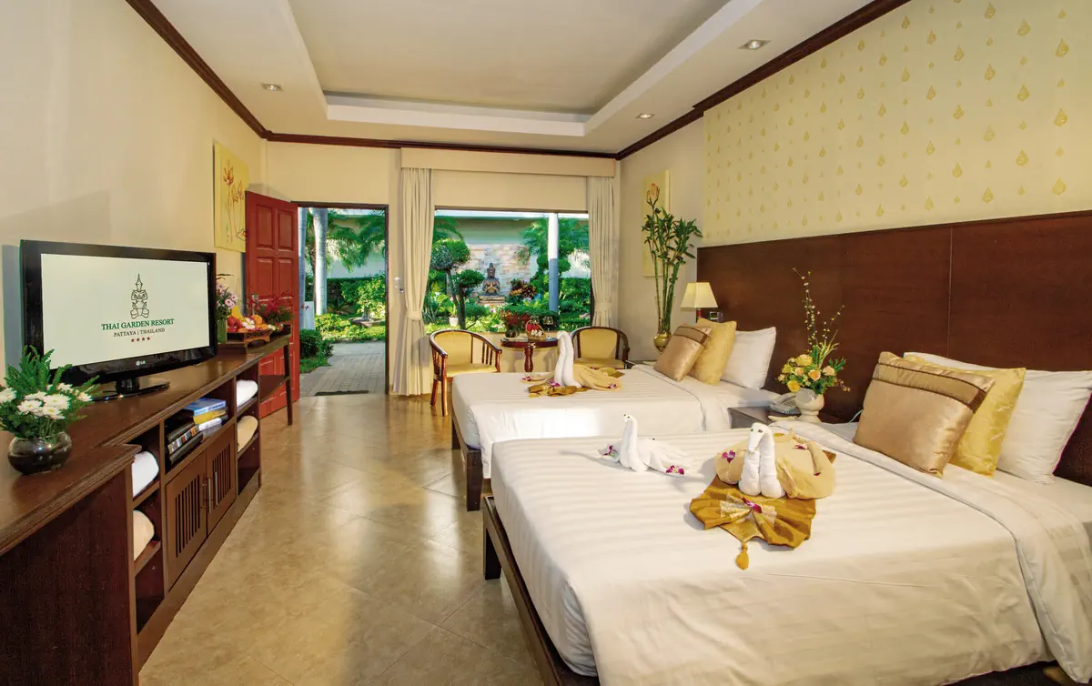 26-30 m², podwójny, deluxe, budynek boczny, parter, od strony basenu boczny, widok na basen (częściowy), dla niepalących , przystosowane dla niepełnosprawnych (pokój na zapytanie), Pościel, ręczniki i materace wykonane w 100% z bawełny organicznej, biurko, prysznic, prysznic ręczny, WC, suszarka do włosów, klimatyzacja, mini lodówka, sejf, TV (kablowa), czajnik, kawa/herbata, taras (umeblowany), 24 H room serviceOne Bedroom Junior Suite Garden View (JBG) - Thai Garden