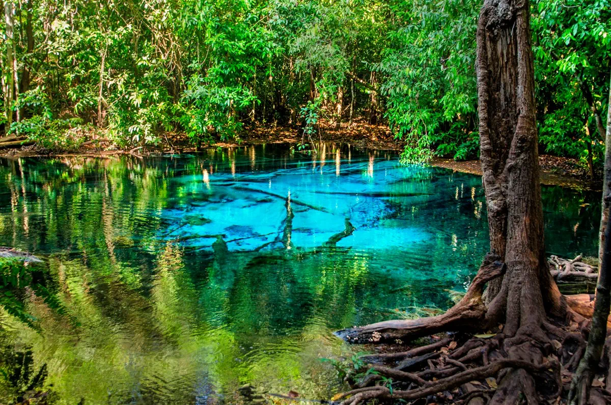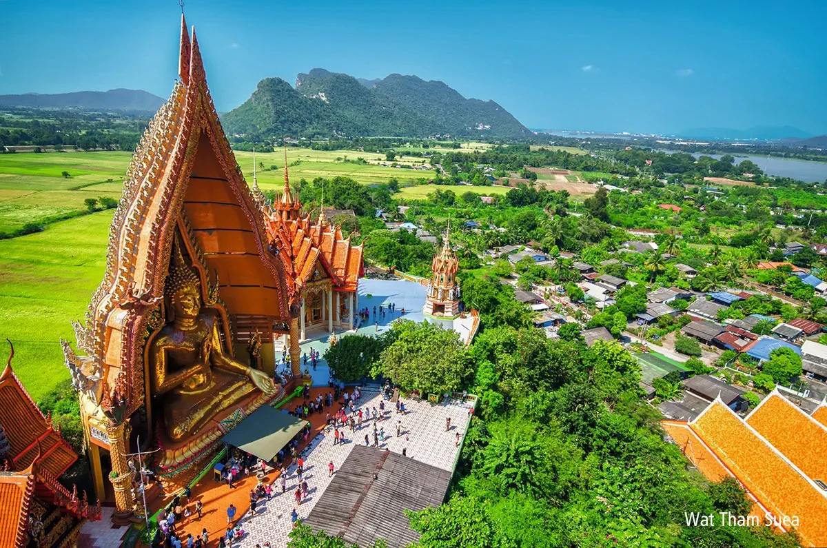 Śniadanie. Wykwaterowanie. Zwiedzanie Wat Tham Suea – Świątyni Tygrysów położonej na szczycie wzgórza, z którego roztacza się panoramiczny widok na okolicę. Wejście na wzgórze wymaga sporego wysiłku, do pokonania jest 1237 stopni. Przejazd na LAGUNĘ SA MORAKOT o zielono-błękitnym kolorze wody, otoczoną naturalnym nizinnym lasem tropikalnym, jednym z ostatnich w Tajlandii. Do laguny prowadzi ścieżka (ok. 1200 m), prowadząca przez tropikalny las bagienny. Można tu zobaczyć rośliny z długimi korzeniami wyrastającymi z bagna, liany zwisające z drzew, które dochodzą do ok. 30 m wysokości, wielkie drzewa powalone przez czas. Czas wolny na kąpiel w krystalicznie czystej wodzie laguny. Przejazd do hotelu, zakwaterowanie, nocleg.
