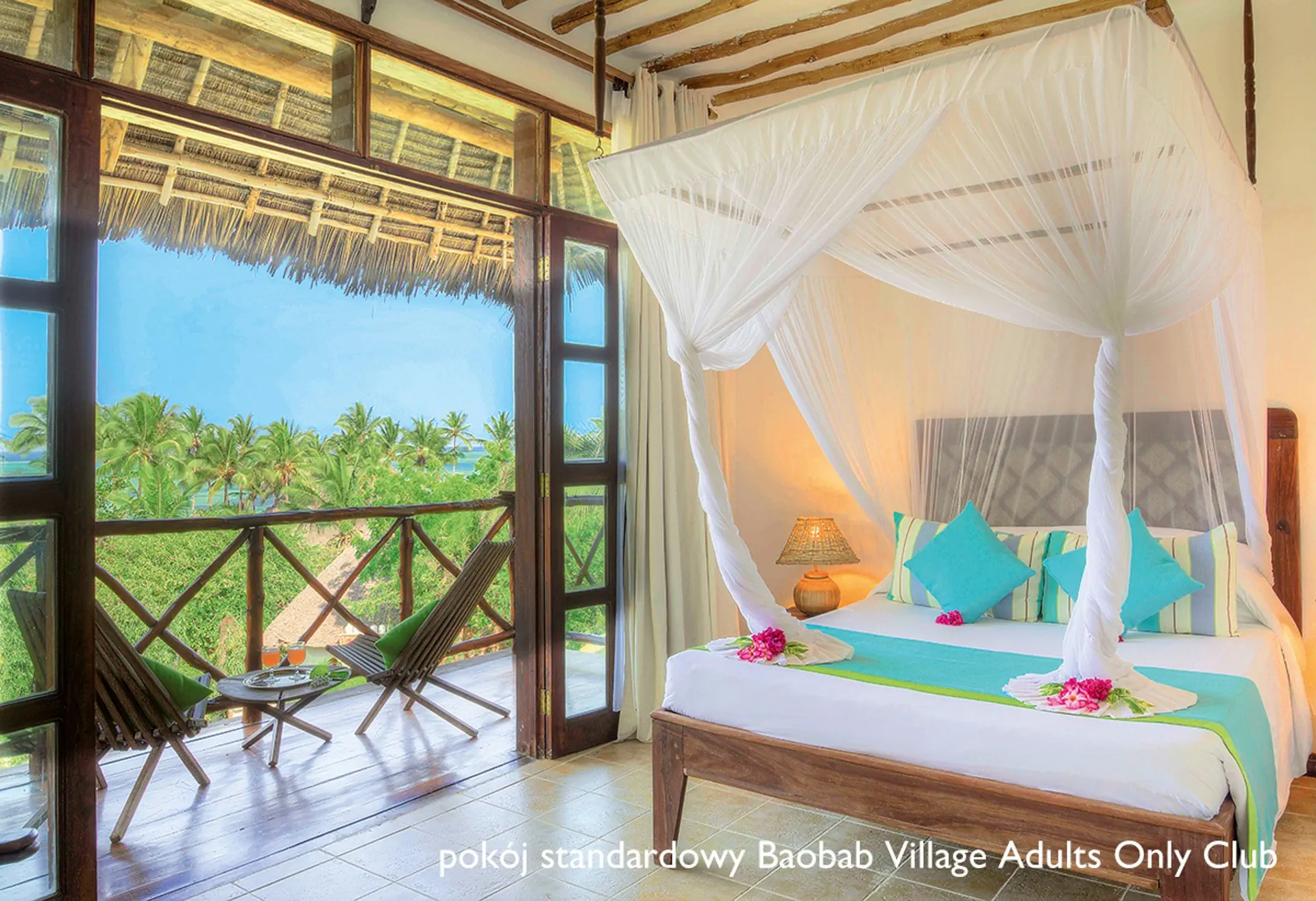 standardowy - 2-os - ok. 24 m² - stylowy - indywidualnie sterowana klimatyzacja - moskitiera - łazienka (prysznic lub wanna, wc, suszarka) - telewizja satelitarna - sejf - taras (stolik i krzesełka)Wyżywienie - Sultan Sands Island Resort - Baobab Village Adults