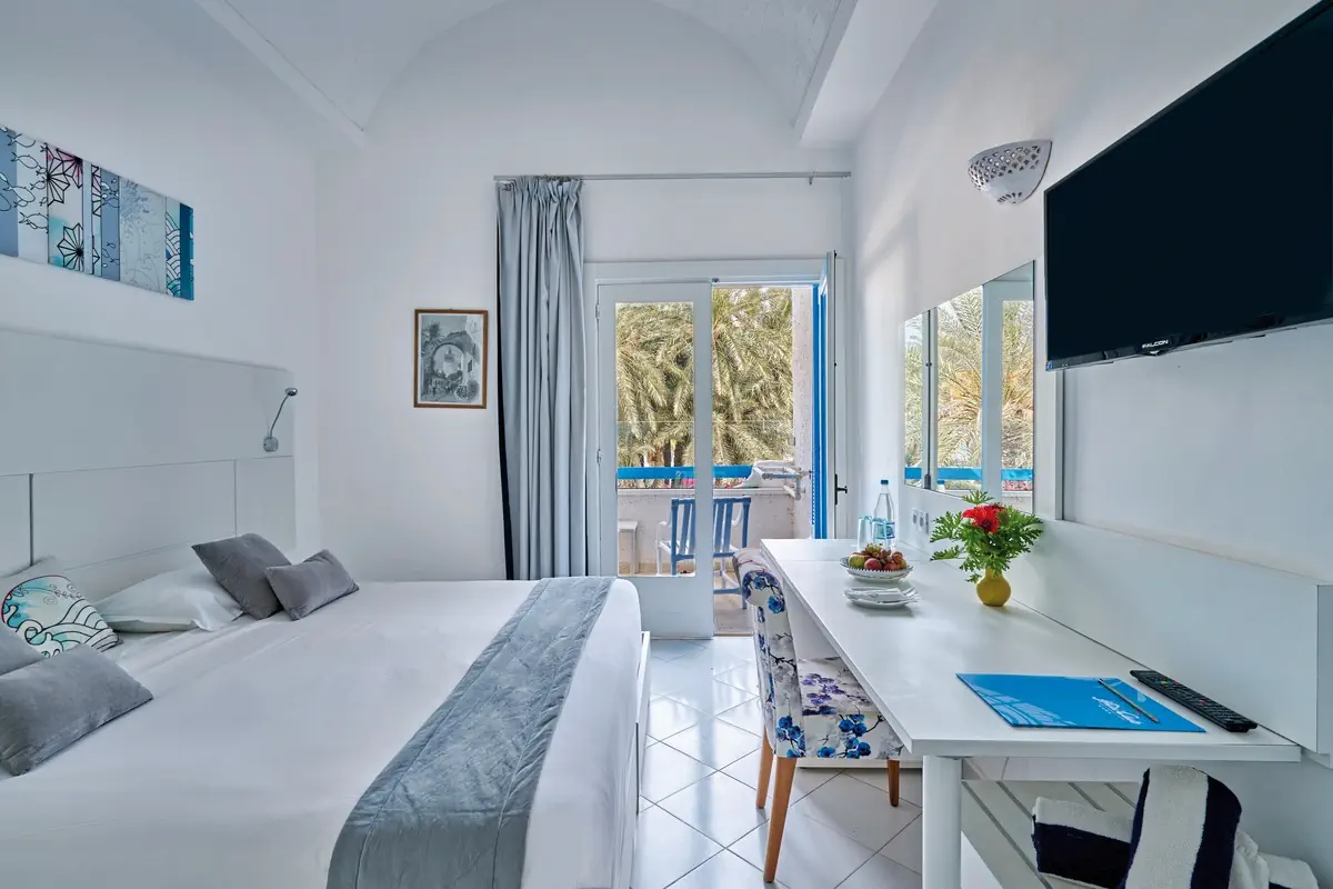 21-25 m², podwójny, widok na ogród, łóżka podwójne (1 łóżko podwójne lub 2 łóżka pojedyncze), prysznic lub wanna, WC, suszarka do włosów, płytki, klimatyzacja, indywidualnie sterowana, ok. 15.6.-15.9., ogrzewanie, indywidualnie sterowana, ok. 1.11.-31.3., mini lodówka, sejf, TV (satelitarna, płaski ekran), Wi-Fi, balkon lub taras, w dniu przyjazdu w pokoju wodaDoppelzimmer Meerblick (DBM/DCM) - Hari Club Beach Resort Djerba