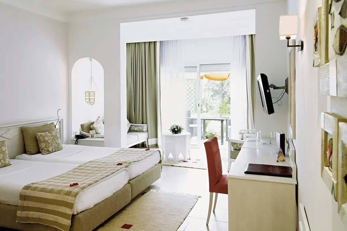 26-30 m², podwójny, z łóżkiem dostawionym, standardowy, budynek boczny, od strony ogrodu, widok na morze, połączony pokój dzienny i sypialnia, pojedyncze łóżko (king size), dwa łóżka (queen size), 1 łazienka, prysznic lub wanna, oddzielne WC, szlafrok kąpielowy, suszarka do włosów, lusterko kosmetyczne, wykładzina dywanowa, klimatyzacja, centralnie sterowana, ogrzewanie, minibar płatne, sejf, 1 TV (satelitarna, programy niemieckojęzyczne, płaski ekran), Wi-Fi, balkon lub taras, zmiana pościeli (3 x w tygodniu), zmiana ręczników (dzienne), 24 H room serviceWyżywienie - Sindbad