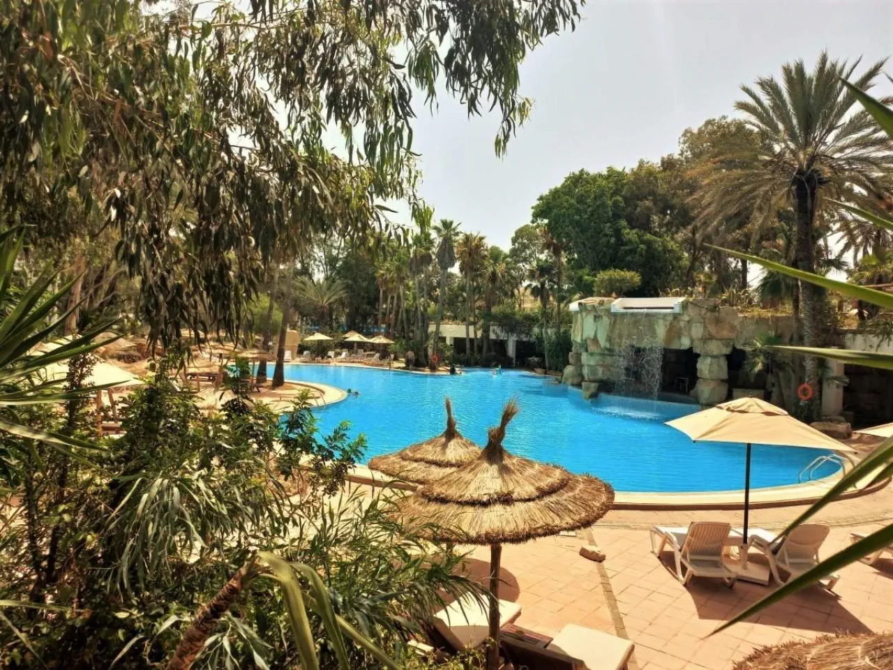 2-piętrowy hotel zaprojektowany w stylu śródziemnomorskim, niedaleko plaży. Odnowione pokoje w 2023 r., malowniczy basen z wodospadem, zielone otoczenie.Położenie - Tunisia Lodge
