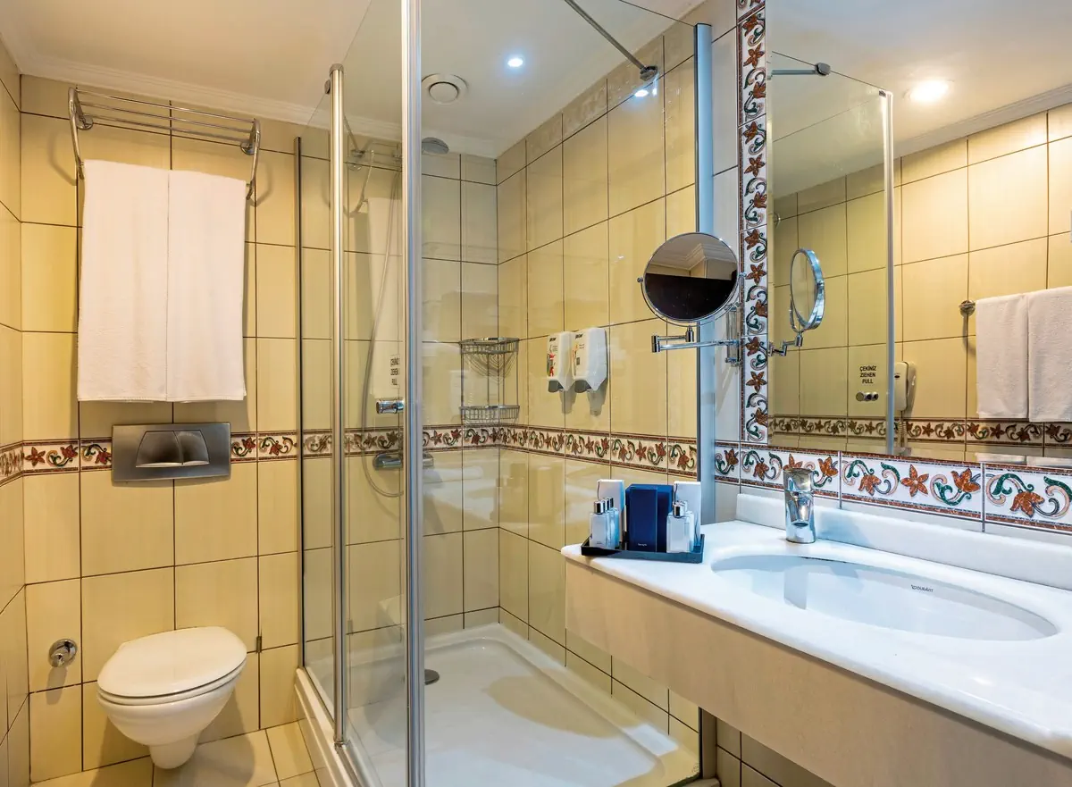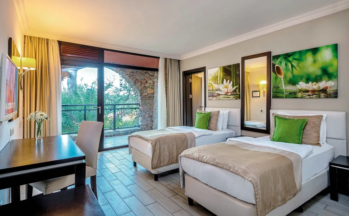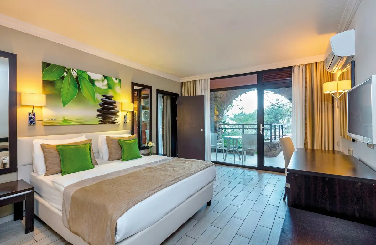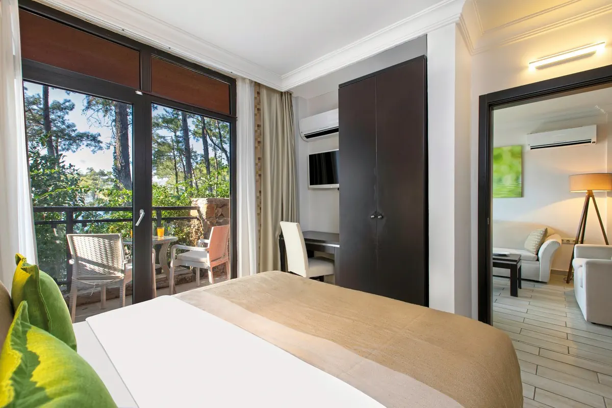 51-60 m², suita, łączone drzwiami, widok na ogród, widok na las, 2 oddzielne sypialnie, oddzielna sypialnia, 2 pojedyncze łóżka, łóżko podwójne, prysznic, WC, suszarka do włosów, lusterko kosmetyczne, płytki, klimatyzacja, indywidualnie sterowana, minibar, wypełnienie codziennie, napoje bezalkoholowe, woda mineralna, woda, sejf, 2 TVs (satelitarna), czajnik, kawa/herbata, balkon lub tarasWyżywienie - Marmaris Bay Resort By MP Hotels (ex. TUI BLUE Marmaris)