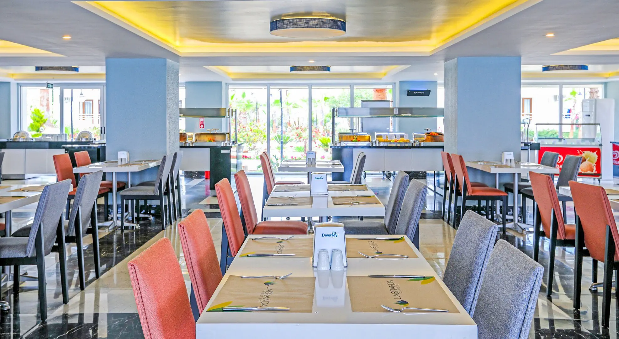 Restauracje - restauracja główna – dania w formie bufetu, kuchnia międzynarodowa, dostępne foteliki dla dzieci, dania wegetariańskie - 2 restauracje à la carte: kuchnia włoska i z owocami morza - 4 bary: w lobby, przy basenie, snack bar, roof bar All inclusive - śniadanie (07.00-10.00), późne śniadanie (10.00-10.30), obiad (12.30-14.00), kolacja (19.00-21.00) w formie bufetu w restauracji głównej - przekąski (12.00-16.00) w snack barze - kawa i ciasto (16.00-17.00) w wyznaczonym barze - napoje bezalkoholowe i lokalne alkoholowe (10.00-23.00) w wyznaczonych barach - raz na pobyt kolacja w wybranej restauracji à - la carte - wymagane noszenie opasek all inclusive. -