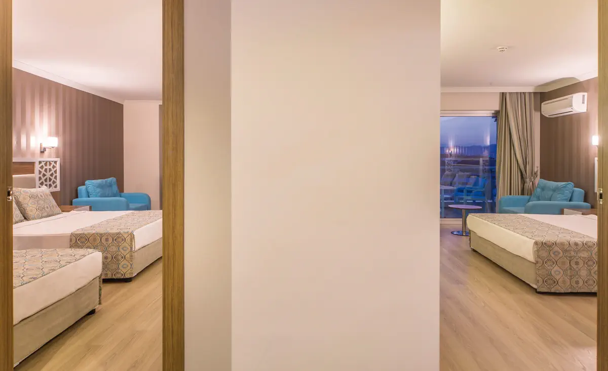 71-80 m², rodzinny, łączone drzwiami, 2 oddzielne sypialnie, oddzielna sypialnia, pojedyncze łóżko, 2 łóżka podwójne, 2 łazienki, prysznic, WC, suszarka do włosów, wykładzina laminowana, klimatyzacja, indywidualnie sterowana, minibar, wypełnienie regularnie, woda mineralna, woda, sejf, TV (satelitarna), czajnik, balkonWyżywienie - Hotel: Lonicera Resort And Spa
