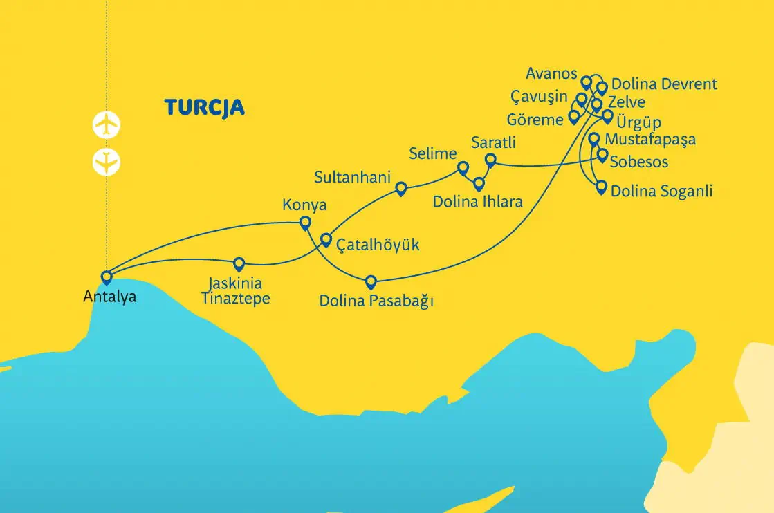 Dzień 1 Zbiórka przy stanowisku odpraw Rainbow na poszczególnych lotniskach na 2 godziny przed wylotem samolotu. Aktualne rozkłady prosimy sprawdzać na www.stronie operatora. Wylot do Antalyi. Po przylocie transfer do hotelu w Antalyi, spotkanie z pilotem. Czas wolny. Klienci przylatujący późnym wieczorem nie mają w tym dniu obiadokolacji, w zamian otrzymają prowiant w postaci pakietów. (Trasa ok. 20 km). Dzień 2 Po wczesnym śniadaniu przejazd do największej w Turcji Jaskini – Tinaztepe, która znana jest ze swoich właściwości leczniczych. Odwiedzimy także Catalhoyuk - jedną z najstarszych odnalezionych osad (datowana jest na około 7500 r. p.n.e.), zwiedzimy tam nowo otwarte muzeum. Następnie odwiedzimy Sultanhani, czyli XII-wieczny seldżucki karawansaray, jeden z najlepiej zachowanych na tych terenach. Obiadokolacja i nocleg w hotelu w Aksaray lub okolicy. (Trasa ok. 520 km). Dzień 3 Po śniadaniu udamy się na spacer do miejscowości Selime, która słynie ze skalnego monastyru uważanego za największy katedralny skalny kościół na terenie Kapadocji. Kolejnym punktem zwiedzania będzie dolina Ihlara - bardzo często ze względu na piękne widoki porównywana z Wielkim Kanionem (trekking połączony z oglądaniem kościołów skalnych). Następnie wyjazd do podziemnego miasta Saratli, w którym zobaczymy jak dawniej mieszkańcy Kapadocji potrafili zagospodarować i wykorzystać swoje naturalne otoczenie w czasie zagrożenia i wojen. Przejazd do hotelu na terenie Kapadocji, przerwa na zdjęcia nad przepięknym jeziorem na dnie krateru. Obiadokolacja i nocleg w hotelu w Kapadocji. Wieczorem dla chętnych wieczorem Pokaz wirujących Derwiszy – cena ok. 28 EUR. lub Hamam VIP – cena ok. 60 EUR. (Trasa ok. 100 km). Dzień 4 W godzinach wczesnoporannych dla chętnych lot o wschodzie słońca Balonem nad Kapadocją - cena ok. 330 EUR (cena obowiązuje na wyjazdy do 30.04.2026; cena aktualizowana jest raz w miesiącu). Po śniadaniu zwiedzimy Sobesos – miasto rzymskie, położone w Kapadocji, w pobliżu wioski Şahinefendi. Następnie przejdziemy do wioski Mustafapasa, zobaczymy kościół Heleny i Konstantyna, poczujemy atmosferę dawnych czasów oraz „grecki” charakter tego miejsca. Wioska ta słynie z późno bizantyjskich kościołów i domów zdobionych motywami zwierzęcymi. Wybierzemy się także na spacer wzdłuż doliny Soganli, gdzie zobaczymy kościoły wykute w skałach (np. Kościół Czarnych Głów). Przejedziemy przez miasteczko Urgup, którego architektura jest połączeniem naturalnych skał z dziełem ludzkich rąk. Możliwość zakupu tureckich słodkości. Powrót do hotelu, obiadokolacja i nocleg. Dla chętnych Wjazd kolejką na wulkan Erciyes (3916m) i wizyta w mieście Kayseri – cena ok. 45 EUR lub z adrenaliną w tle tle (pakiet 3 atrakcji Zipline/JetBoat/JeepMonster) cena ok. 90 EUR. Dzień 5 Po śniadaniu w hotelu przejazd do wioski Cavusin - jednej z najbardziej malowniczych osad w Kapadocji. Zobaczymy tam m. in. Kościół skalny św. Jana Chrzciciela z bardzo charakterystycznymi reliefami i freskami. Następnie udamy się na spacer po Twierdzy Uchisar, która góruje nad Kapadocją i skąd rozpościera się cudowny widok. Twierdza jest niewątpliwie jednym z największych cudów natury na tym terenie. Potem udamy się do Goreme gdzie zwiedzimy wpisane na Listę Światowego Dziedzictwa UNESCO muzeum kościołów skalnych, z pięknie zachowanymi freskami, przedstawiającymi najważniejsze postacie chrześcijaństwa. Po zwiedzaniu wybierzemy się na spacer wśród okolicznych dolin, gdzie wyobraźnia podpowie nam co przedstawiają poszczególne formacje skalne i dlaczego miejscowi nazywają jedną z nich „doliną miłości”. Następnie jeepami udamy się do kilku najpiękniejszych miejsc regionu, gdzie będziemy podziwiać księżycowe krajobrazy bajkowej Kapadocji. Będzie też okazja do zrobienia niepowtarzalnych zdjęć z panoramy w Goreme. Możliwość zakupu wyrobów skórzanych i biżuterii z onyxu. Późnym popołudniem dla chętnych wyprawa quadami po bezdrożach „Krainy Pięknych Koni” cena ok. 60 EUR lub wyprawa konna cena ok. 80 EUR. Obiadokolacja i nocleg w hotelu w Kapadocji. Po kolacji zapraszamy chętnych (za dodatkową opłatą ok. 35 EUR) na nocny spacer bajecznymi dolinami Kapadocji. Przemierzając Doliną Gołębi będziemy podziwiać oświetloną Twierdzę Uchisar i iluminacje w dolinie Goreme. Wieczór zakończymy lampką kapadockiego wina degustowaną na punkcie widokowym z którego podziwiać będziemy niepowtarzalną panoramę Kapadocji. (Trasa ok. 60 km). Dzień 6 Po śniadaniu udamy się na panoramę Devrent - gdzie naturalne formy skalne „spłatały figla” i przybrały niebywałe postacie zwierząt i bestii. Spacer po Avanos - mieście słynącym z oryginalnych wyrobów ceramicznych, których proces tworzenia będziemy mogli zobaczyć. Odwiedzimy drugie najsławniejsze skupisko kościołów skalnych Zelve będące również, miejscem gdzie, aż do 1924 roku żyli we wspólnocie muzułmanie i chrześcijanie. Dzień zakończymy spacerem po pełnej „kapadockich grzybów” dolinie Pasabagi. To właśnie tam mnisi żyli w odosobnieniu w celach wydrążonych w skałach. Obiadokolacja i nocleg w hotelu w Kapadocji. Wieczorem dla chętnych Noc Turecka cena ok. 50 EUR. (Trasa ok. 60 km). Dzień 7 Po śniadaniu przejazd do Konyi - niegdyś stolicy Seldżuków, gdzie zobaczymy wzgórze Alladinów. Wzgórze zostało usypane specjalnie dla Alladina Keykubata I (usypane z ziem wszystkich terenów należących do Seldżuków). Ujrzymy także XIX wieczny meczet Aziziye łączący w sobie niepowtarzalne style architektoniczne. Kolejno udamy się do Muzeum Karatay, słynącego ze wspaniałych zbiorów sztuki islamskiej. Przejazd do Antalyi, obiadokolacja i nocleg w hotelu w Antalyi. (Trasa ok. 620 km). Dzień 8 Po śniadaniu wykwaterowanie z hotelu. Następnie transfery: - dla Klientów pozostających na d