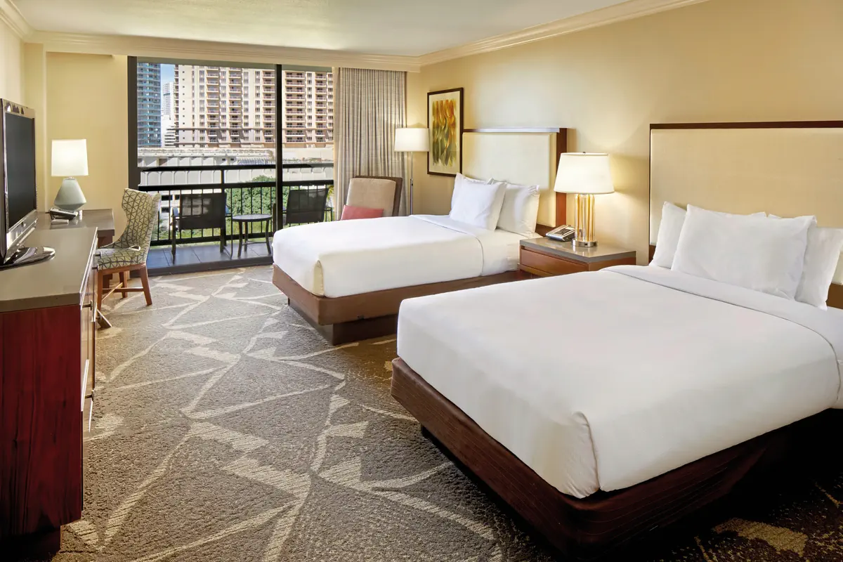 31-35 m², podwójny, widok na morze, łóżka podwójne (1 łóżko king size lub 2 łóżka podwójne), prysznic lub wanna, WC, szlafrok kąpielowy, suszarka do włosów, klimatyzacja, mini lodówka, sejf, deska do prasowania, żelazko, TV, Wi-Fi, ekspres do kawy, balkon, usługi conciergeWyżywienie - Hilton Hawaiian Village