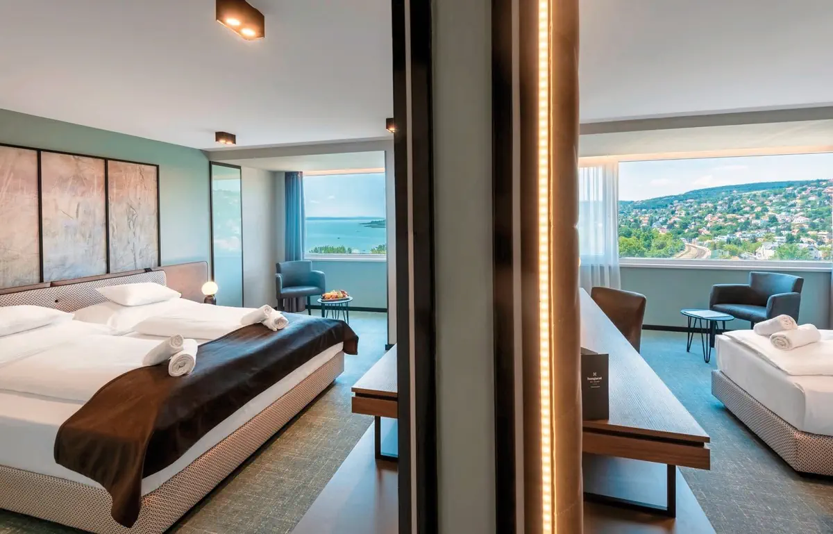 36-40 m², junior suite, widok na jezioro, oddzielna sypialnia, 1 łazienka, prysznic, WC, szlafrok kąpielowy, suszarka do włosów, klimatyzacja, minibar, sejf, 1 TV (satelitarna, płaski ekran), Wi-FiFamilienzimmer (FB1) - Ramada Resort (Balatonalmadi)