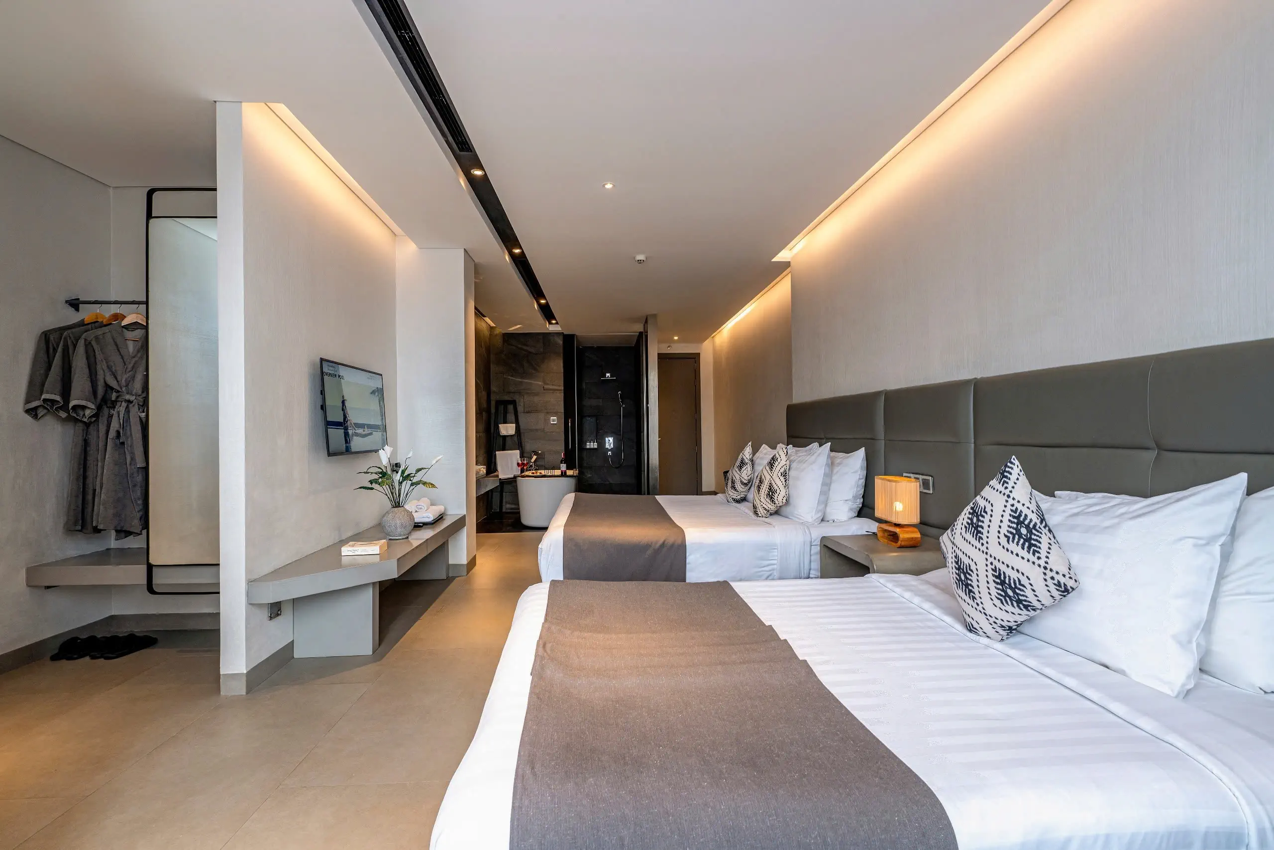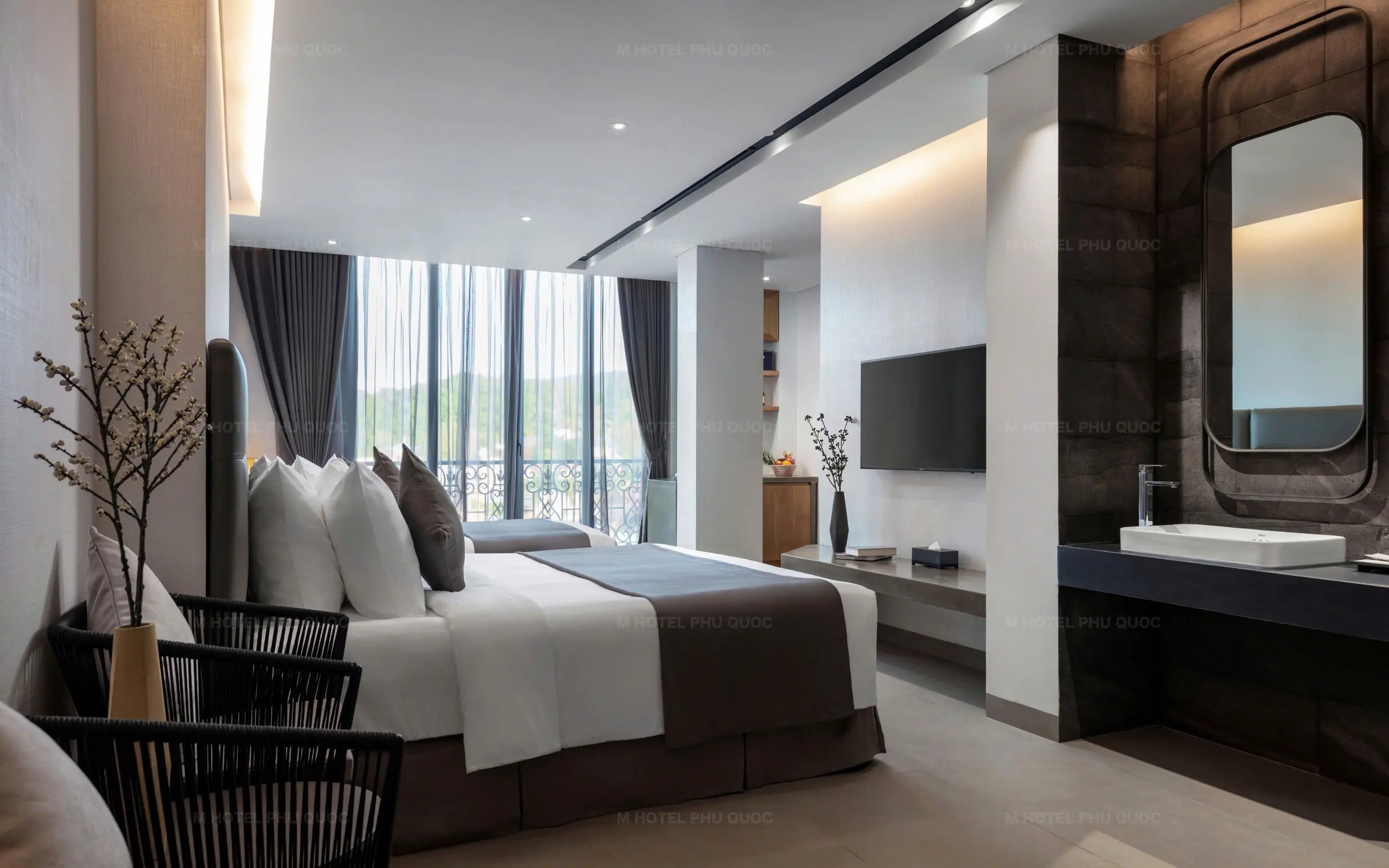 Dla max. 3 osób, Kanały telewizji: Angielski, Telefon w pokoju, wanna i prysznic , Powierzchnia pokoju: ok. 45 m2, Rodzaj podłogi: płytki, Sprzątanie codziennie, 1 sypialnia, Maksymalna liczba osób dorosłych: 2, Maksymalna liczba dzieci: 2, Widok na morze, Liczba łazienek: 1, Liczba toalet: 1, Zestaw do parzenia kawy i herbaty, Klimatyzacja: Klimatyzacja indywidualnaDELUXE TRIPLE SUITE CITYVIEW WITH BALCONY - M Hotel Phu Quoc