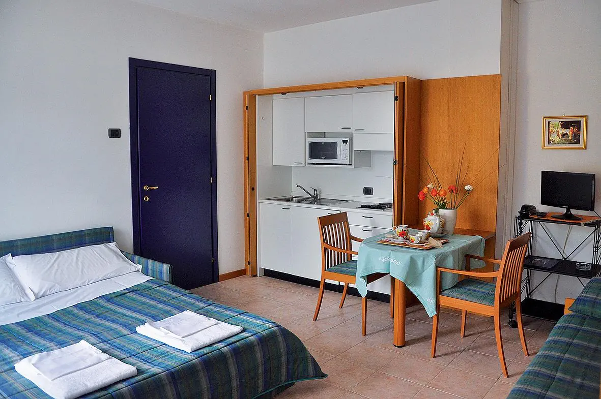 mono 2 - 22 do 28 m - pokój dzienny z aneksem kuchennym w szafie i z łóżkiem małżeńskim , łazienka, zwykle balkon możliwy tylko za dodatkową opłatą mono 2+1 - 24 m - pokój dzienny z aneksem kuchennym, łóżkiem podwójnym i rozkładaną kanapą typu "szuflada" dla 1 osoby dorosłej lub 2 dzieci do nieukończonych 12 lat, łazienka bilo 4 - 28 do 32 m - 1 sypialnia z łóżkiem małżeńskim, pokój dzienny z aneksem kuchennym w szafie i rozkładaną kanapą typu "szuflada" dla 2 osób, łazienka apartamenty z balkonem można dokupić za dodatkową opłatą Dodatkowe wyposażenie: TV, suszarka do włosów (tylko w apartamentach bilo), sejf, kuchenka mikrofalowa (tylko w niektórych apartamentach mono), wi-fiWyżywienie - Residence Biancaneve