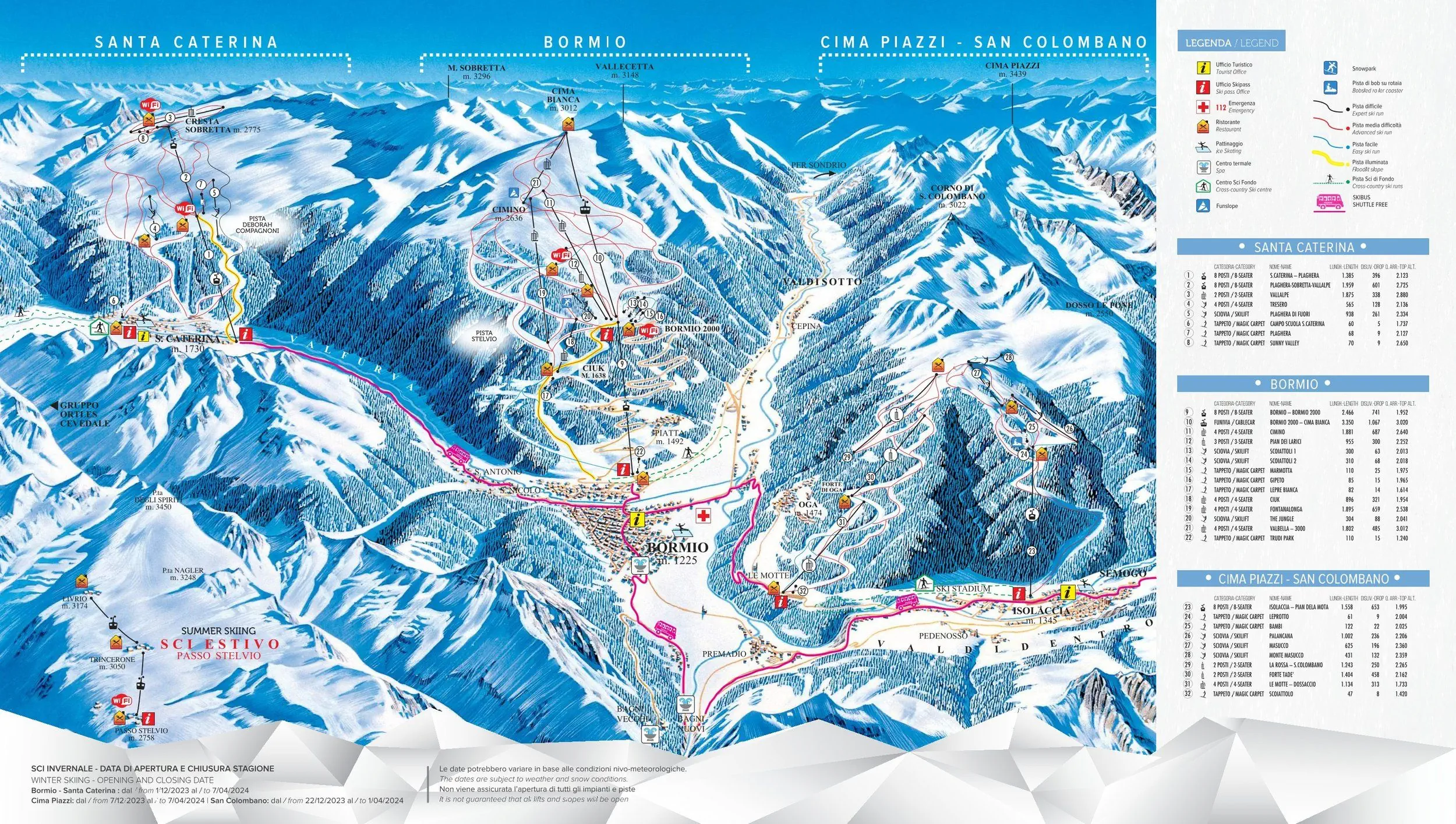 Maks. wysokość: 3017 mMin. wysokość: 1200 mWys. miejscowość: 1225 mWyciągi łącznie: 9Orczyki: 3Krzesełka: 4Gondole: 2Trasy łącznie: 50 kmTrasy zielone/niebieskie: 16 kmTrasy czerwone: 22 kmTrasy czarne: 12 km