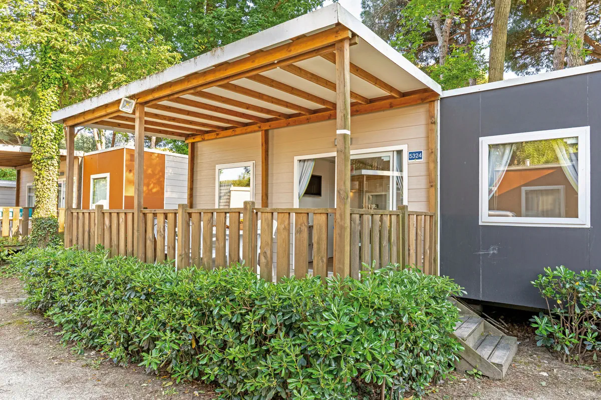 26-30 m², chalet, wyremontowany, 2 oddzielne sypialnie, połączony pokój dzienny i jadalnia, pojedyncze łóżko, łóżko podwójne, łóżko piętrowe, prysznic, WC, klimatyzacja, TV, aneks kuchenny, kącik jadalny, loggia (umeblowany), 1 miejsce parkingowe na jednostkę mieszkalną, pościel w cenie, zmiana pościeli płatne, ręczniki w cenie, zmiana ręczników płatne, tekstylia kuchenne należy zabrać ze sobą, koszt energii (bezpłatne), sprzątanie końcowe płatne na miejscu lub we własnym zakresie (ok. 50 EUR/pobyt), (ok. 50 CHF/pobyt), depozyt (bar, ok. 100 EUR/pobyt), (ok. 100 CHF/pobyt)Lodge Comfort (CB4) - Village Adriano Camping